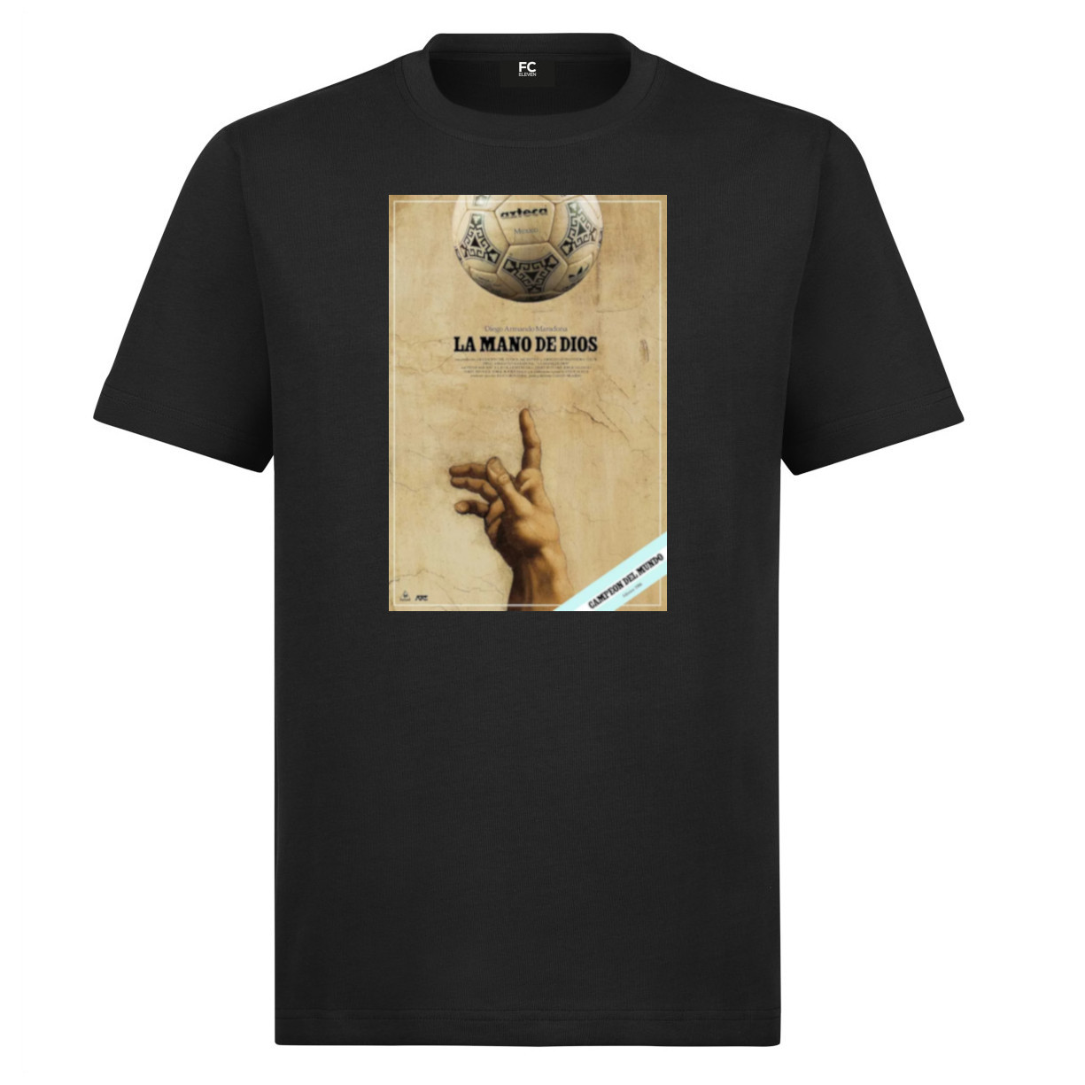 Cool football t-shirt with print of the 'Hand of God'. During the 1986 World Cup, England and Argentina played against each other in the quarter finals. The match ended in 2-1 for the Argentinians and Maradona scored both goals. However, Diego scored the first goal with his hand, but the referee did not notice this. After the match, Maradona said about this: 'I scored a little with the head of Maradona and a little with the hand of God'. The print shows the Azteca football that was played with during the 1986 World Cup and at the bottom the outstretched hand from Michelangelo's most famous painting (the creation of Adam). The t-shirt is completely black and has a round neck.