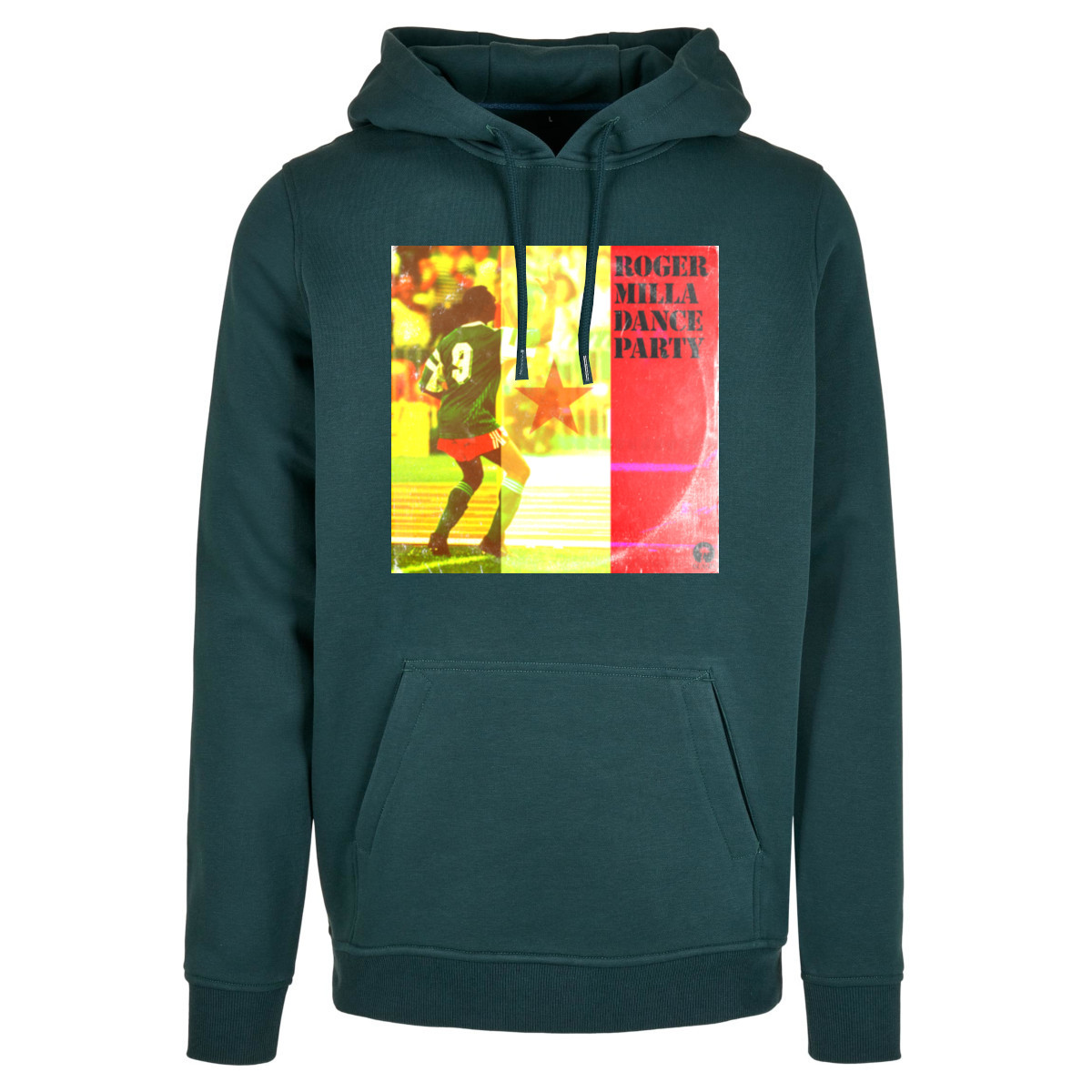 Cool hoodie in dark green as an ode to Cameroonian star player Roger Milla. In the middle of the chest is a cool photo print of a dancing Roger Milla in the Cameroon outfit. The print is further decorated with the text: Roger Milla Dance Party. Roger Milla was known for his dances at the corner flag after scoring a goal. Roger Milla is seen as one of the best African footballers of all time. However, Milla did not only become world famous for his way of dancing and cheering when scoring goals. Partly because of him, Cameroon became the first African country ever to reach the quarterfinals of a World Cup in 1990. At this tournament in Italy, Mila became one of the stars of the tournament at the age of 38 with 4 goals. Four years later, Mila became the oldest goal scorer at a World Cup ever at the age of 42. During his career, he played 102 international matches for Cameroon.