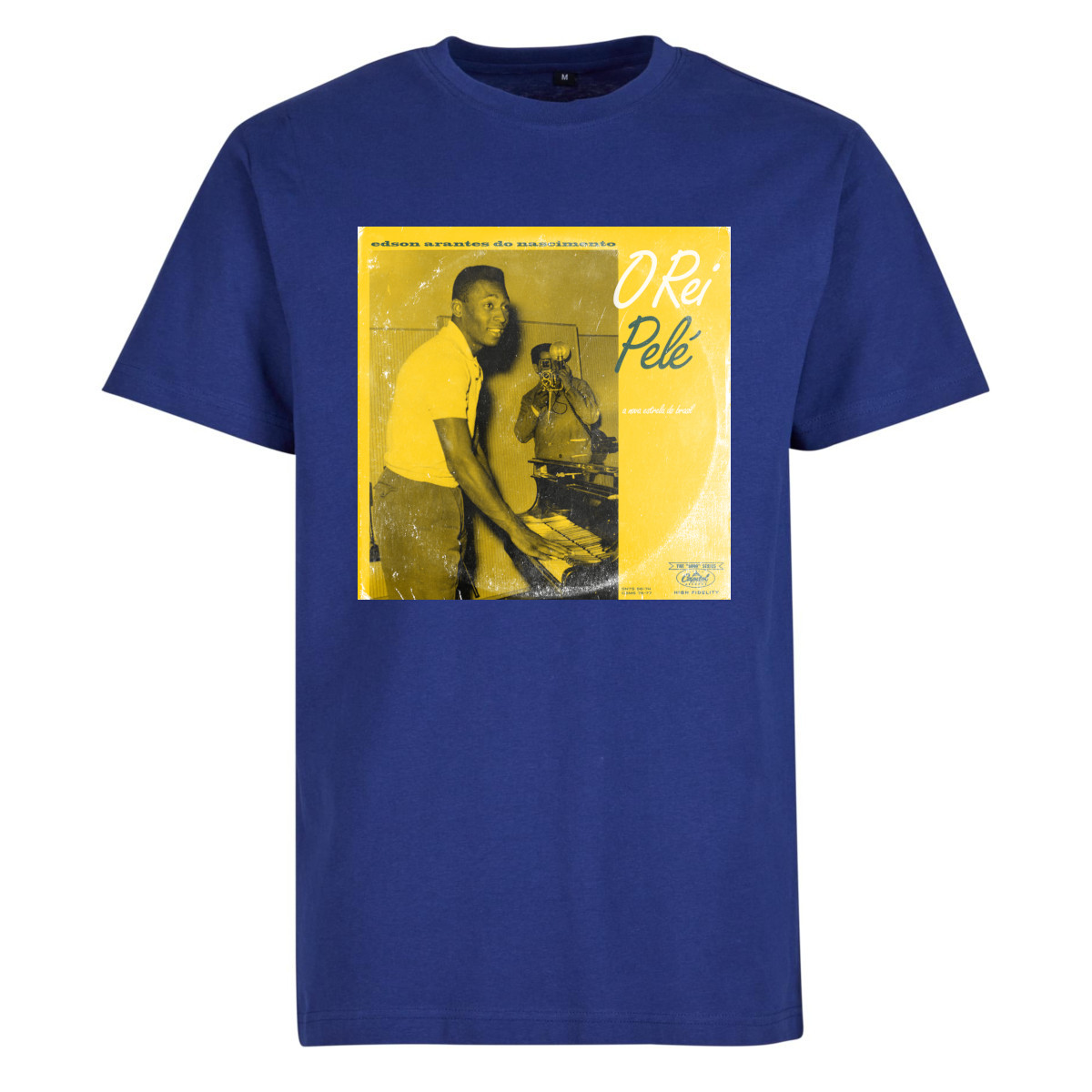 Cool football t-shirt in dark blue as an ode to Brazilian star player Pelé. A cool photo print of O Rei Pelé is displayed in the middle of the chest. The yellow print in the middle of the hoodie depicts Pele in his younger years. It shows him playing the piano. The print is further decorated with the full name of the Brazilian ex-superstar: "Edson Arantes do Nascimento". Of course, his other nickname "O Rei" (The King) is also on the print. Pele has an incredibly high average as a striker, both in club and international football. For example, he scored 619 goals in 638 matches for Santos in club football. For Brazil, he scored 77 goals in 92 international matches. Partly due to Pele's contribution, the teams in which he excelled won many prizes. Pele won the world title 3 times with Brazil, among other things. Many people consider Pele to be the best football player of all time. The t-shirt is completely dark blue and has a round neck. The t-shirt has a regular fit. Material: 100% cotton.