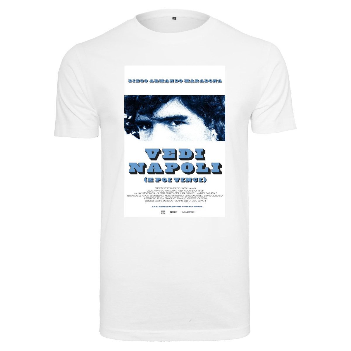 Cool football t-shirt with print of Diego Maradona and Napoli. In the 1986-87 season, Napoli won the Serie A for the first time in history under the leadership of Diego Maradona. In the period 1984-1991, Diego played 259 matches for Napoli and managed to score 115 times. In addition to the Serie A, Maradona also won the UEFA Cup with the Italian club. The t-shirt is completely white and has a round neck. The t-shirt has a normal fit. Material: 100% cotton.