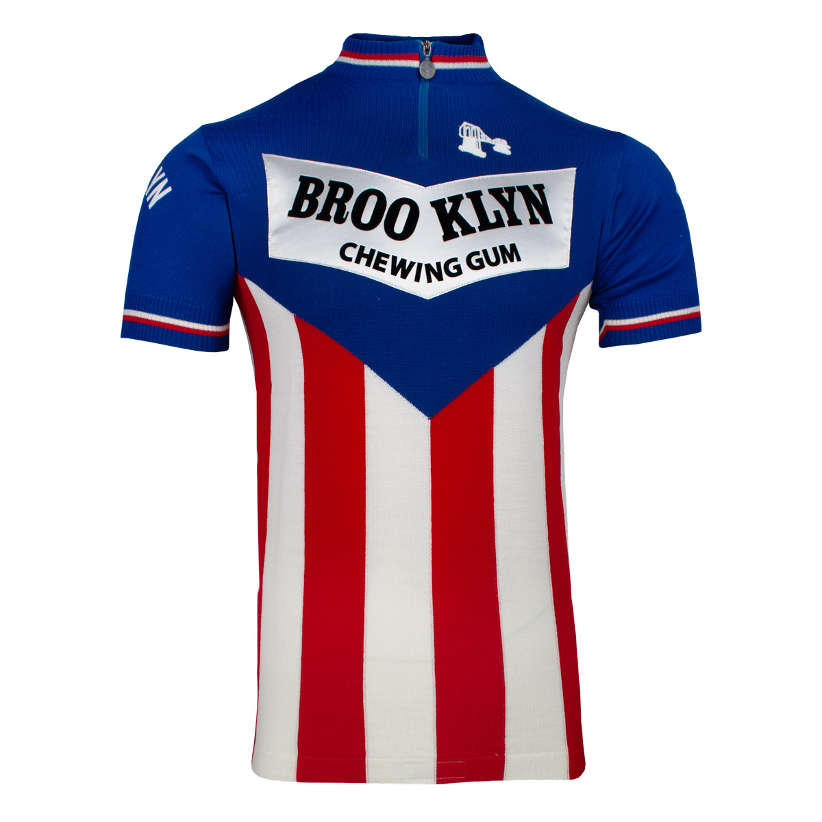 This shirt is the Brooklyn 1975 replica cycling shirt from the brand Magliamo. The Italian cycling team is best known for the beautiful Gios Torino bicycles and the beautiful cycling shirts. This vintage racing jersey is made from 100% pure Italian merino wool. The retro cycling shirt from Brooklyn has a striking design in blue with white and red. The bottom of the cycling jersey contains red and white vertical stripes and the top is blue. These colors are separated by a large v-shape. The name of the cycling team and sponsor Brooklyn Chewing Gums on the center of the chest. This logo is also applied to the back of the retro cycling jersey. The sleeves of the vintage jersey are blue and contain the name of the team, Brooklyn. The piping has a white and a red line. These two stripes also come back at the neck. Furthermore, this retro Brooklyn cycling shirt naturally has a zipper up to the chest.
