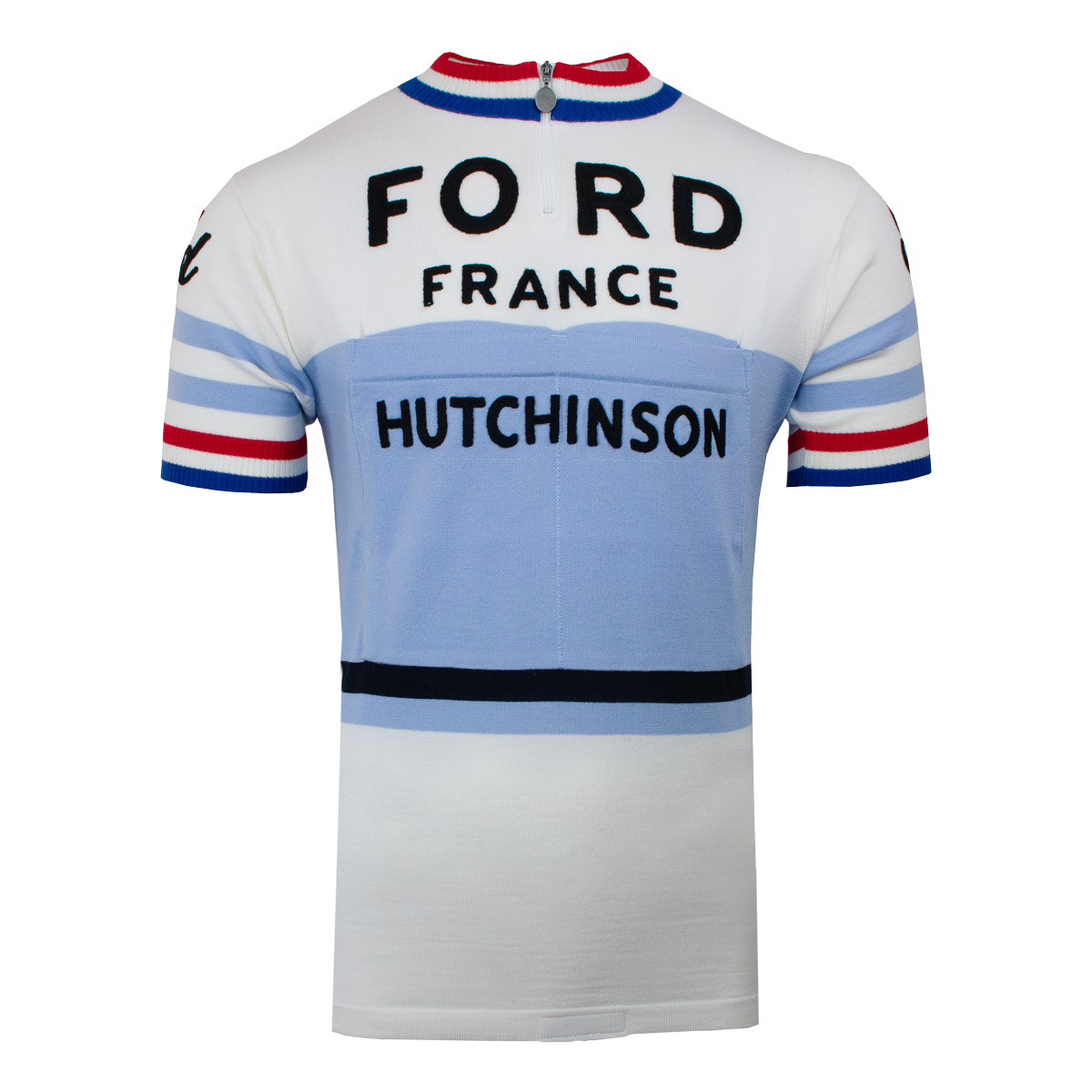 This shirt is the Ford France 1966 retro cycling shirt from the brand Magliamo. This vintage racing jersey is made from 100% pure Italian merino wool. The retro cycling shirt from Ford France is predominantly white with blue and red details. In the middle of the cycling jersey is a wide light blue track with the name of tire manufacturer Hutchinson. This light blue section also contains two chest pockets. Above is the name of the Ford France cycling team, a subsidiary of the American car factory Ford Motor Company. The sleeves are characterized by thin stripes in light blue, red and blue. The collar also features the colors of the French flag (red, white and blue). On both shoulders is the name of the main sponsor Ford. Furthermore, this retro Molteni cycling shirt naturally contains a zipper up to the chest. On the back on the bottom of the cycling jersey the characteristic pockets. Above these bags is also the name of the cycling team, Ford France Hutchinson.