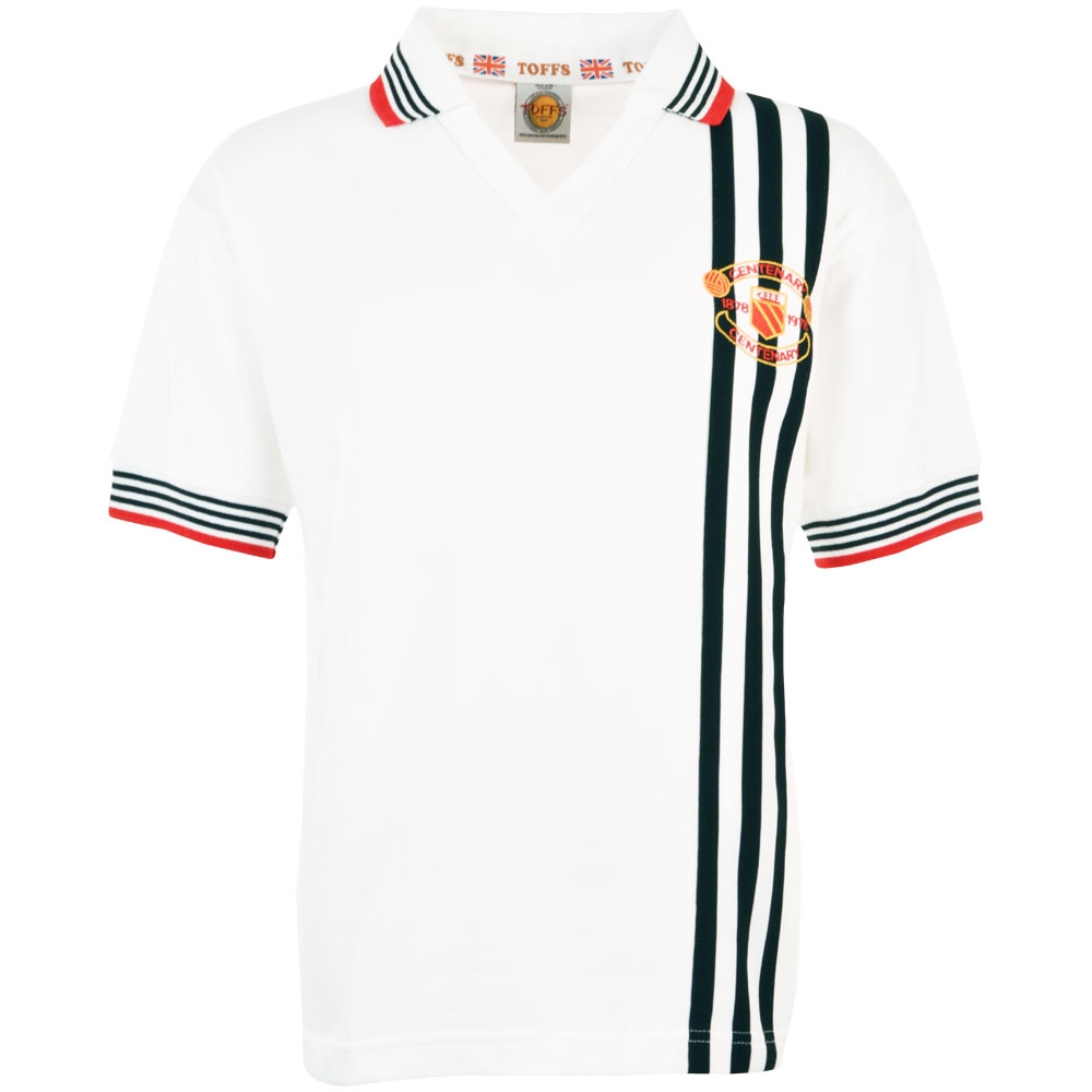Nostalgic Manchester retro shirt based on the away shirt from the 1978-1979 season. In connection with the 100th anniversary of Manchester United, a special 'centenary' shirt was launched. The Manchester Reds retro shirt has short sleeves and a collar. The collar and trims are in white with black stripes and a red stripe at the bottom. On the chest of this white Manchester away shirt is a special centenary logo. Three black vertical stripes run through the logo. The Manchester Reds football shirt from TOFFS has a regular fit.