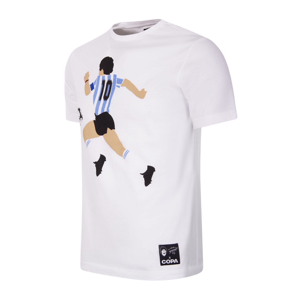 Maradona t-shirt from the official Maradona x COPA Football collection. The t-shirt is white and has a round neck. The t-shirt is characterized by a large graphic print of Diego Maradona in the Argentina football shirt during the 1986 World Cup in Mexico in the middle of the chest. The print shows Diego as captain of the Argentinian football team with the ball in his vicinity. An iconic image in which Maradona has control over the ball and searches for an opponent at speed. With Maradona's help, Argentina wins the World Cup during the 1986 World Cup in Mexico. Maradona is also chosen as player of the tournament. Great t-shirt from the official Maradona x COPA collection. Ideal for the real Diego Maradona fan! Material: 100% cotton.