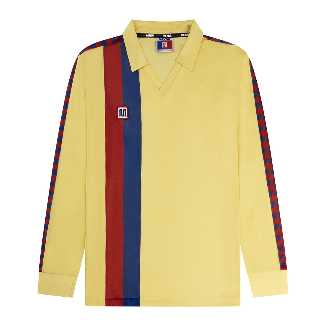 Meyba Barcelona Retro Football Shirt 1981/85 (Long Sleeves) for adults. This football shirt is based on FC Barcelona’s away shirts from the period 1981 to 1985. The Barcelona shirt features long sleeves and is predominantly yellow with blue and red accents. These blaugrana colours appear on the right side of the shirt. It also has a V-neck and a yellow polo collar. Across the shoulders and sleeves, the Meyba trademark stripes are applied. The right chest features the Meyba brand logo. The Meyba Barcelona shirt has a regular fit. Material: 100% polyester.