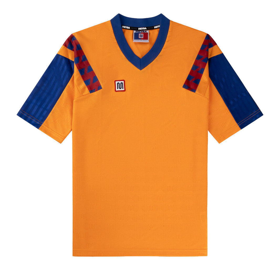 Meyba Barcelona retro football shirt 1991-1992 for adults. This football shirt is based on the famous orange Barcelona away shirt from the successful 1991/92 season. The Barcelona football shirt is predominantly orange in color and contains red and blue details. The v-neck is blue and there is a blue area on both sleeves. The Meyba trademark taping runs from the chest towards the shoulders to the shoulder blades. On the right chest the Meyba logo and the other contains the outline of the Barcelona emblem. The Meyba football shirt from Barcelona has a normal fit. Material: 100% polyester.