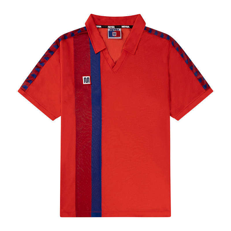 Meyba Barcelona retro football shirt 1987/89 for adults. This red football shirt is based on the third shirt of FC Barcelona from the 1987–1991 period. The rare shirt is predominantly red and features two vertical stripes in red and blue (blaugrana) on the right side. The Meyba trademark taping decorates both sleeves. These zigzag stripes are also in red and blue. The right chest features the Meyba logo. In addition, the retro Barça shirt has a red polo collar and a V-neck. Material: 100% polyester.