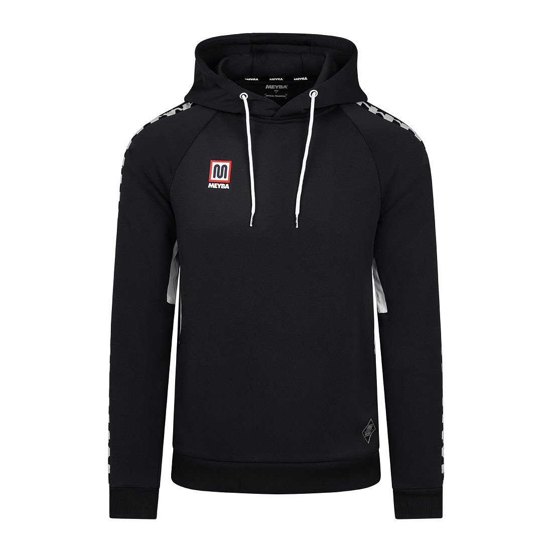 Meyba hooded sweater in black for adults. The hoodie is predominantly black and has white accents. The Meyba hoodie is characterized by the Meyba trademark stripes on both sleeves. This zigzag stripe is in black with white. The hood has a string to adjust it and the right chest has the Meyba logo. Furthermore, the Meyba hoodie has two pockets. Material: 100% polyester.
