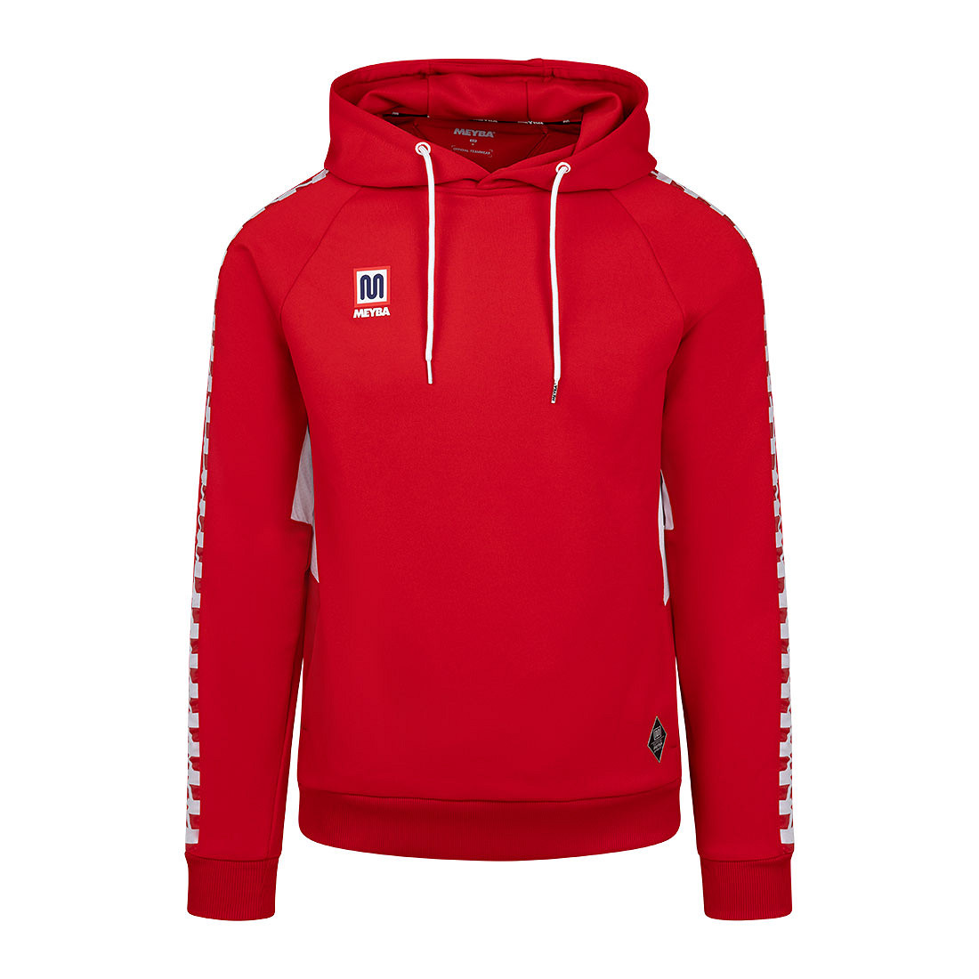 Meyba hooded sweater in red for adults. The hoodie is predominantly red and has white accents. The Meyba hoodie is characterized by the Meyba trademark stripes on both sleeves. This zigzag stripe is in red with white. The hood has a string to adjust it and the right chest has the Meyba logo. Furthermore, the Meyba hoodie has two pockets. Material: 100% polyester.
