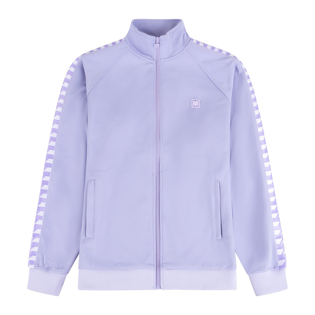 Meyba track jacket in light purple for adults. The track jacket is based on the Meyba football jackets from the 80s. The training jacket is predominantly light purple and is characterised by the Meyba trademark stripe on both sleeves. These zigzag stripes are applied to the training jacket in white. The Meyba logo is on the left chest and the jacket also has two slit pockets. The name of the Meyba brand is applied to the neck of this track jacket. The light purple Meyba track jacket has a normal fit. Material: 100% polyester.