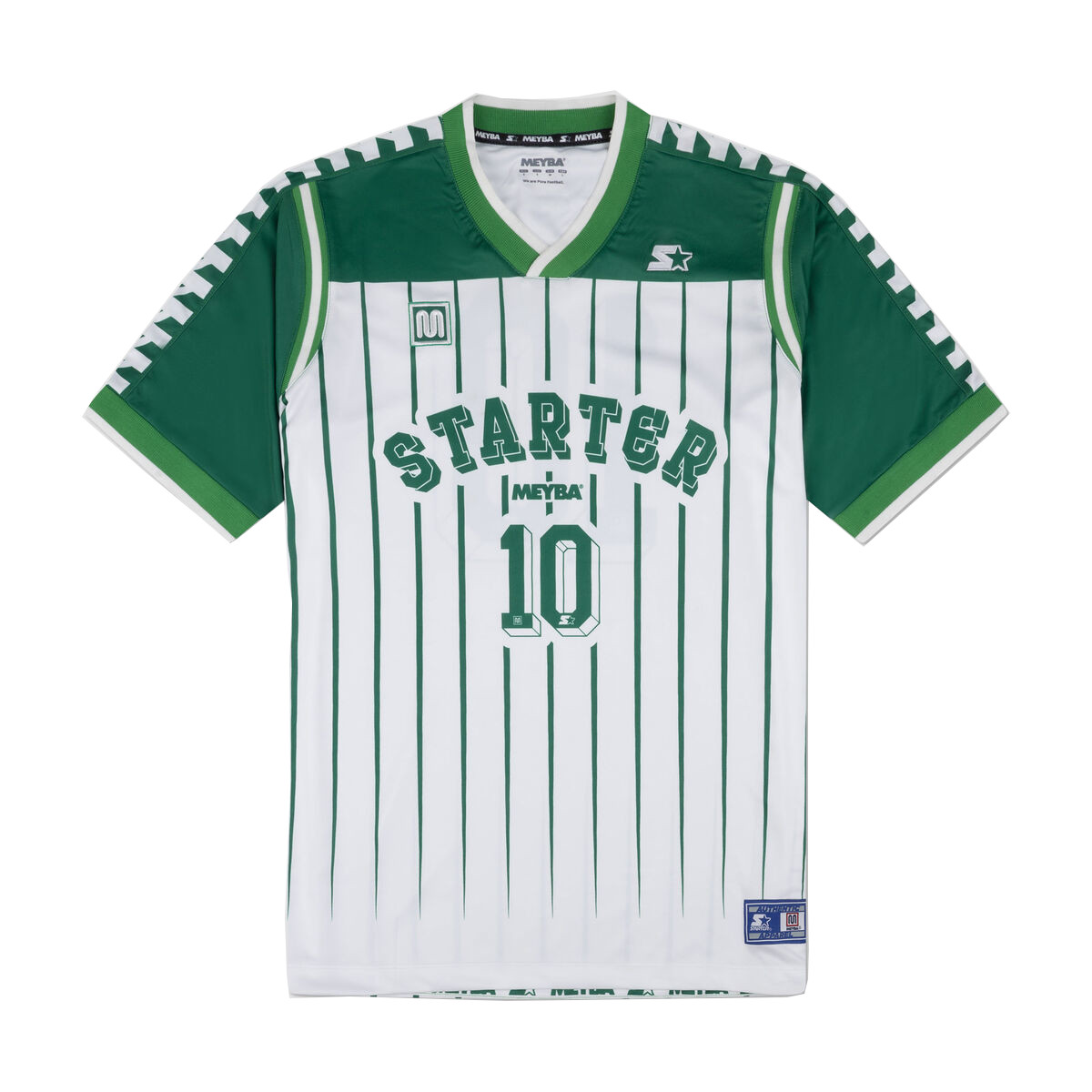 This is the official Meyba x Starter shirt for adults. The MEYBA x Starter jersey is inspired by the classic Basketball shirts from the 90s. The Meyba NBA shirt is predominantly white and is characterized by thin green stripes. The name of the brand Starter is in the middle of the chest and number 10 below it. This number is also on the back. In addition, the shirt has a v-neck in green and white. The trademark stripes of Meyba are applied over the sleeves. The logo of Meyba is on the right chest and the logo of the American sports brand Starter on the left chest. The Meyba x Starter Basketball shirt has a spacious fit. Material: 100% polyester. LIMITED EDITION!
