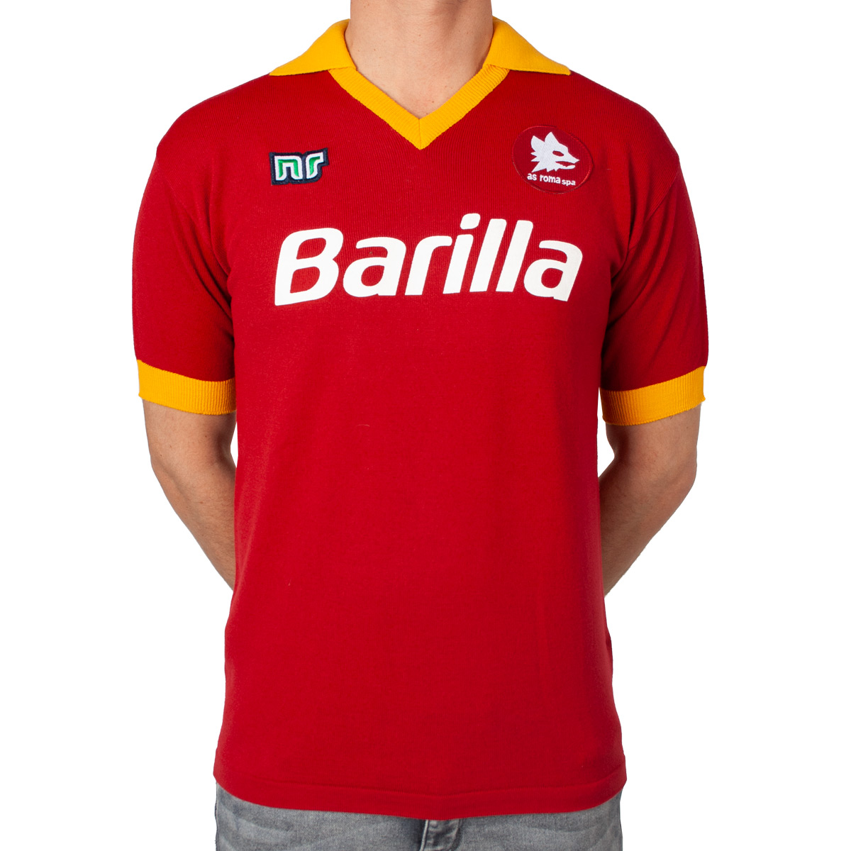 This shirt is the official AS Roma NR Nicola Raccuglia authentic replica football jersey from the 1987-1988 season. This AS Roma football shirt is produced in the same way and with the same materials by Ennerre in Italy as it was in the 1980s. Ennerre (Nicola Raccuglia) was also the clothing sponsor of AS Roma in the 1980s.