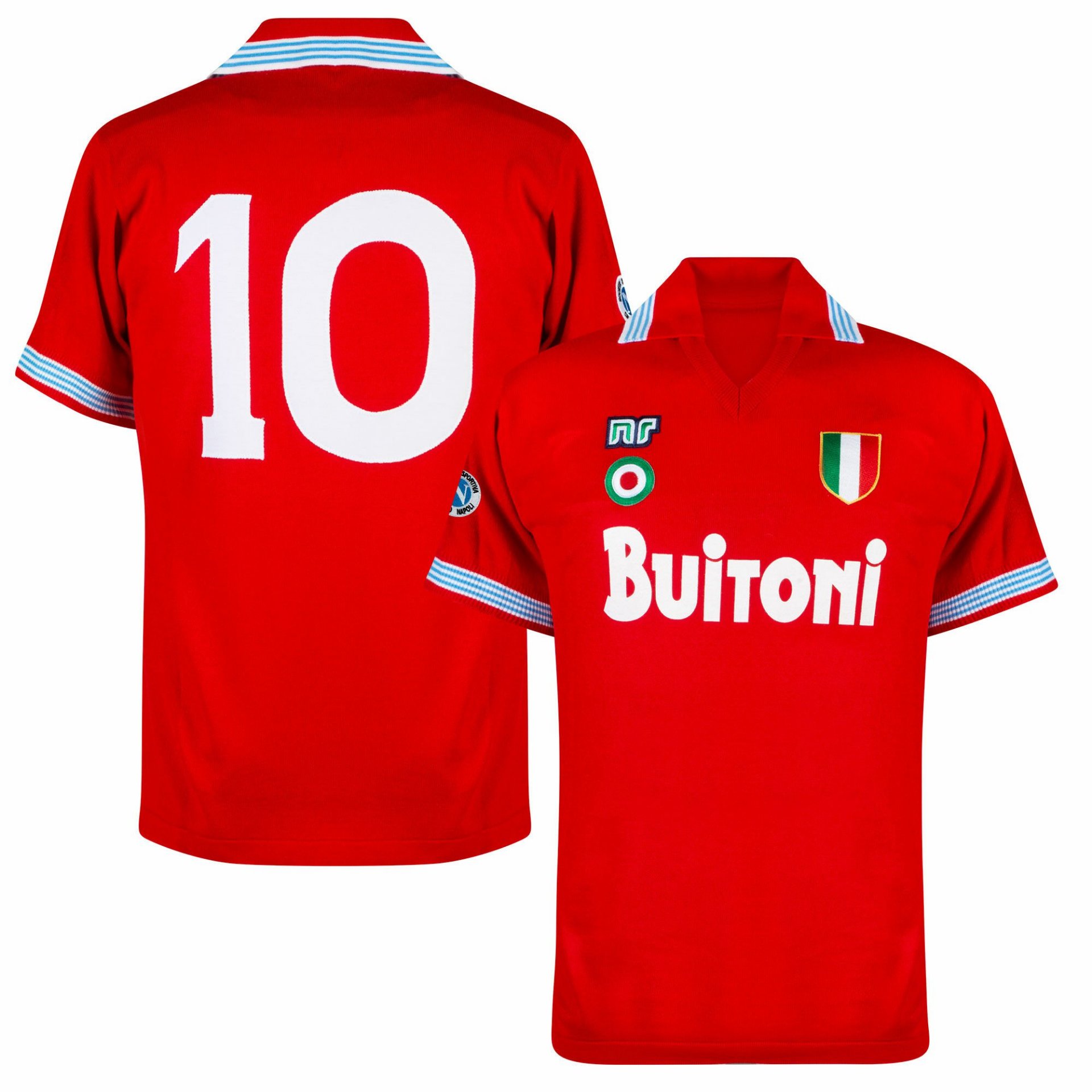 Legendary red Napoli retro shirt with sponsor BUITONI on the chest. This Napoli 3rd jersey is the official re-release of the Napoli jersey Diego Maradona wore during the 1987-88 season. The back of the shirt contains number 10 in white. This retro Maradona Napoli shirt features the Ennerre badge on the right chest and the Coppa Italia badge below. On the left chest the Scudetto badge. The Napoli logo is on the right sleeve. Furthermore, the shirt has a v-neck and a polo collar. A collector's item! The collar and trims have white and light blue stripes.