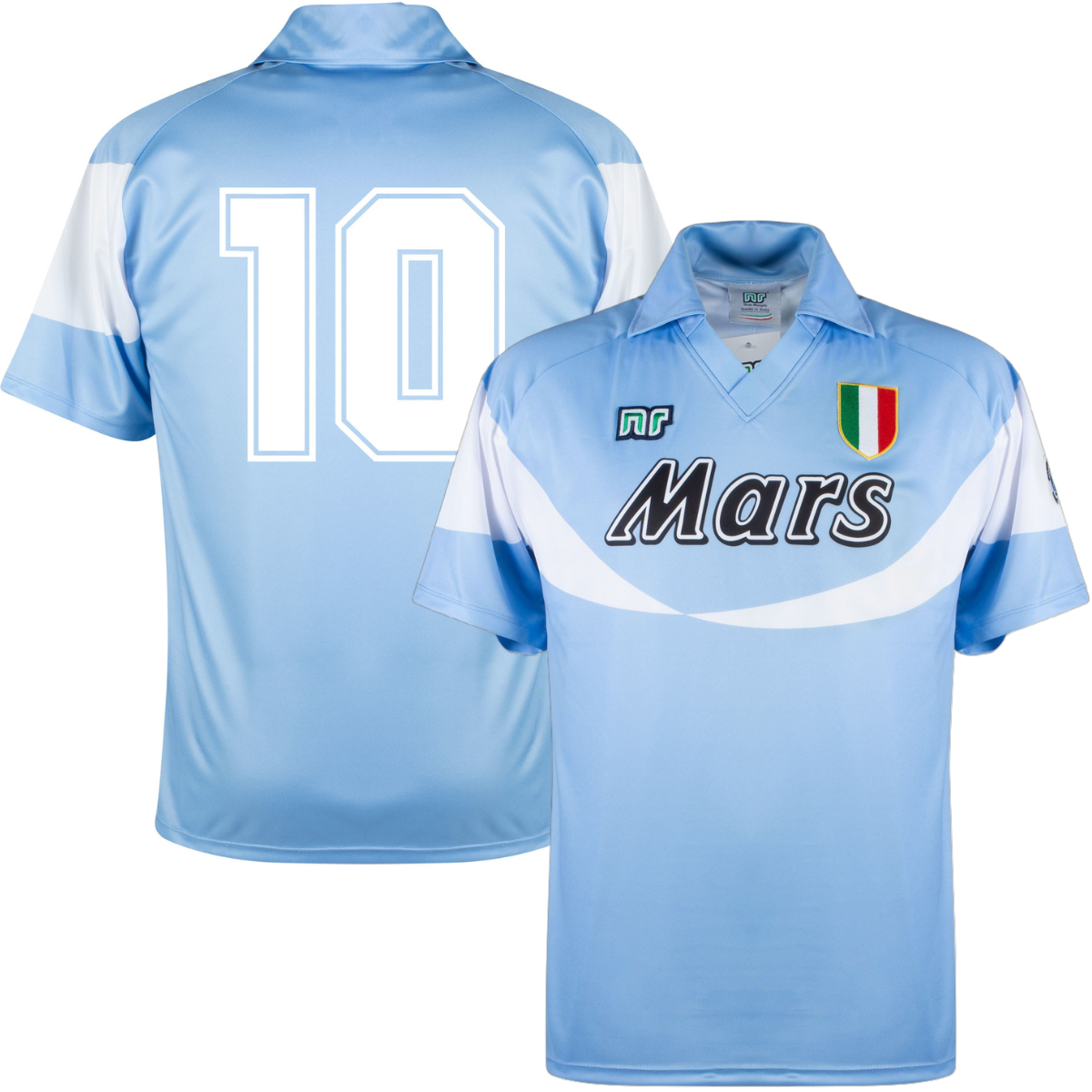 Legendary Napoli retro shirt home with MARS sponsor on the chest. This retro football shirt is the official re-release of the shirt Diego Maradona wore during the 1990-91 season. This retro Maradona Napoli shirt has the Ennerre badge on the right patch en the Italian patch on the left chest. The Napoli logo is on the left sleeve. Furthermore, the shirt contains a v-neck and a polo collar. The Napoli home football shirt is characterized by the white 'wave' on the chest en sleeves. A real collector’s item!