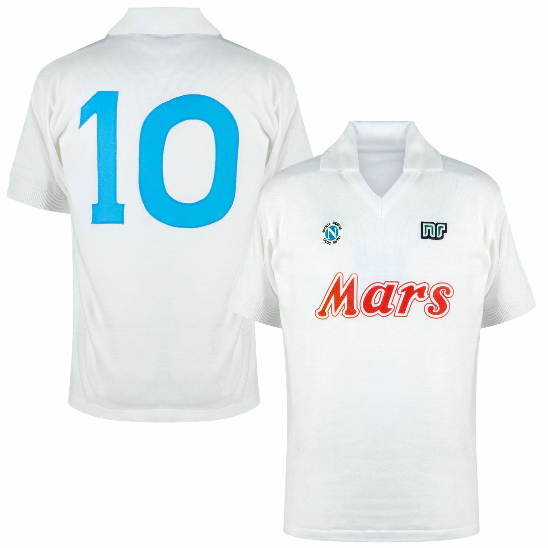 Legendary white Napoli retro shirt away with Mars sponsor on the chest. This retro football shirt is the official re-release of the shirt Diego Maradona wore during the 1988-89 season. The shirt has the famous number 10 stitched on te back in lightblue. This retro Maradona Napoli shirt has the Ennerre badge on the right chest and the Napoli badge on the other. Furthermore, the shirt contains a v-neck and a polo collar. A real collector’s item!