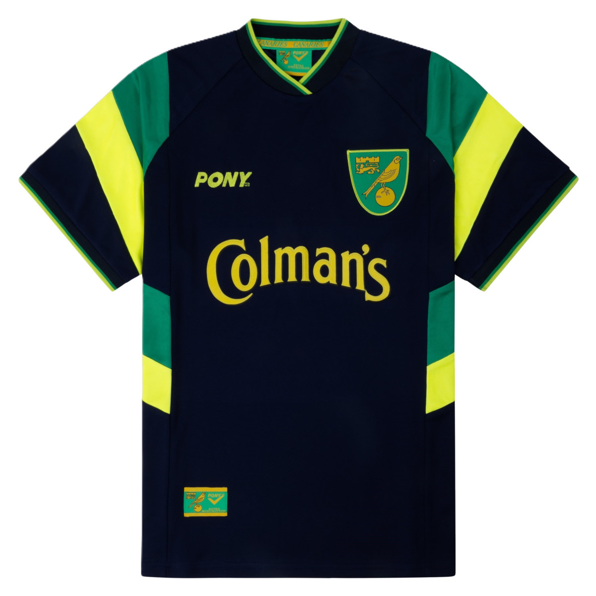 This is the official Pony Norwich City retro football shirt 1997 - 1999 for adults. This Norwich City retro football shirt is based on the 3rd shirts which were worn in the period 1997 to 1999. The dark blue Norwich retro football shirt has short sleeves and contains yellow and green details. The v-neck has a thin green and yellow stripe and the piping also contains these colours. The green and yellow colours also appear on the areas at the height of the shoulders and on the sides of the shirt. The name of the then sponsor Colman's is in the middle of the chest. On the left chest the logo of Norwich City FC and the right contains the name of clothing sponsor Pony. This Norwich City football shirt was worn in the seasons between 1997 and 1999 by players such as Craig Bellamy, Erik Fuglestad, Victor Segura, Danny Mills and many more players. Material: 100% polyester.