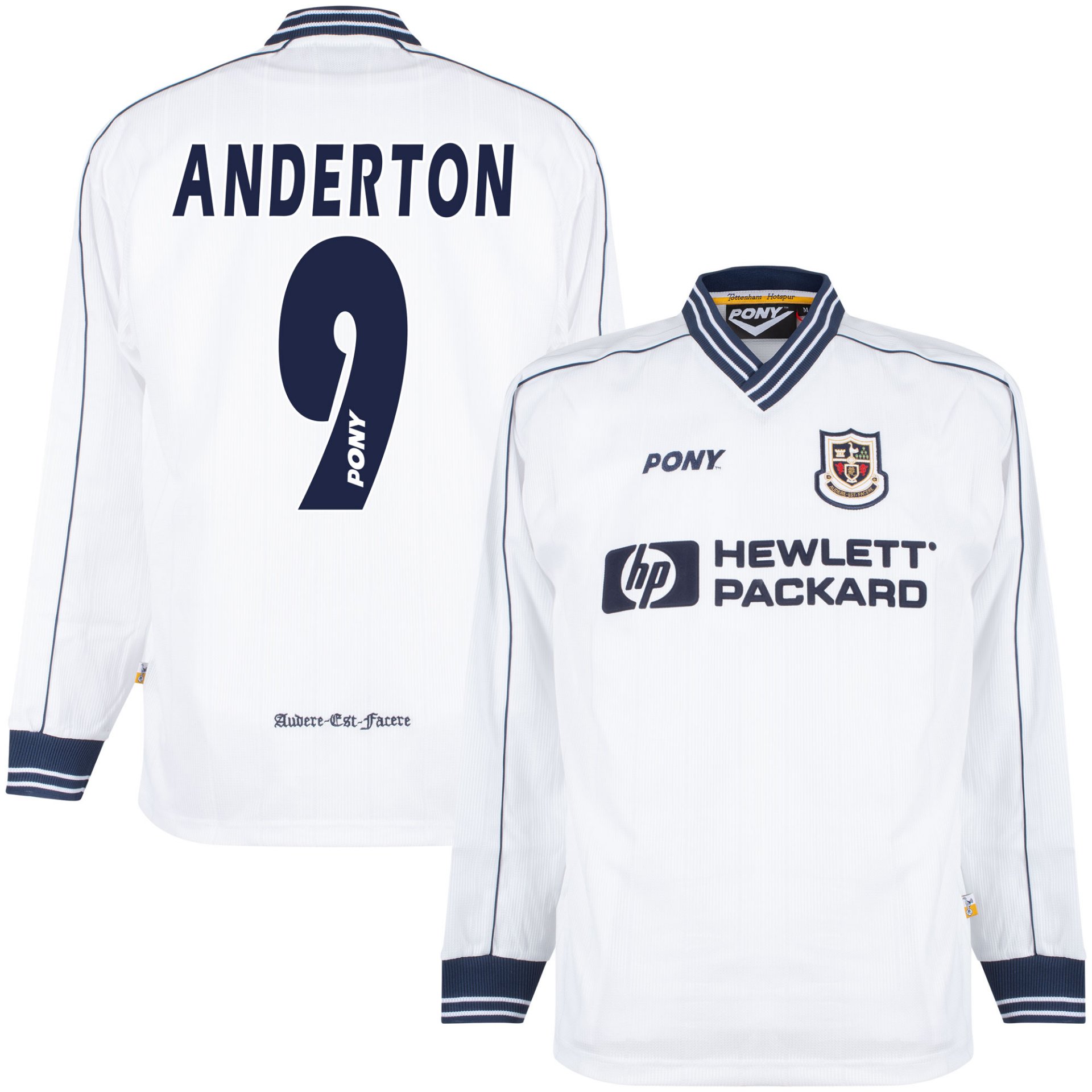 Tottenham Hotspur long sleeve retro football shirt 1996/98 from the brand Pony for adults. The back contains the print of Anderton (9). This Tottenham Hotspur retro football shirt is based on the football shirt that was worn in the period 1996-1998. This retro football shirt has exactly the same design as the football shirt from that time. The white Tottenham football shirt has long sleeves and a v-neck. The piping and the v-neck are navy blue and white striped. In the middle of the chest the name of the then sponsor Hewlett Packard. On the left chest the logo of the Spurs and the right contains the name of clothing sponsor Pony. On the back of the Spurs football shirt the motto of the club is embroidered: Audere est facere. This Tottenham Hotspur football shirt was worn in the season between 1996 and 1998 by players such as Teddy Sheringham, Darren Anderton, Sol Campbell, Les Ferdinand, David Ginola and other star players. Material: 100% polyester.