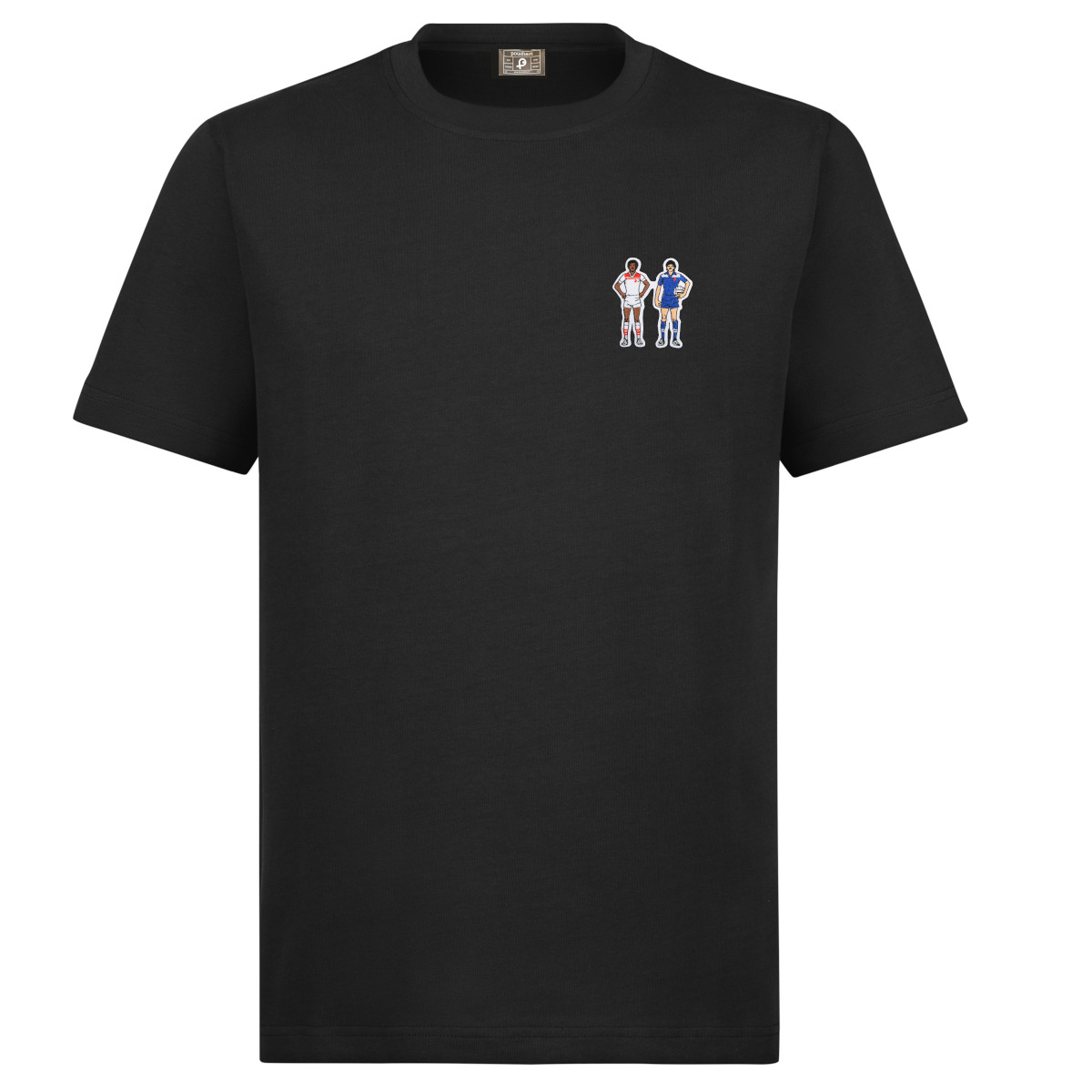 Cool football T-shirt by Pouchain x Peter O'Toole for adults. The heavy T-shirt is made from thick organic cotton. The distinctive feature of this T-shirt is the graphic print of Bari Calcio on the back. The print shows two players from football club Bari wearing the home and away kits from the 1980/81 season. Below are the Pouchain and Peter O'Toole logos. The Pouchain T-shirt also features a badge on the front depicting the two Bari players. The heavy T-shirt is entirely black and comes with a crew neck. Made from heavyweight cotton, it has a regular fit. Material: 100% organic cotton.