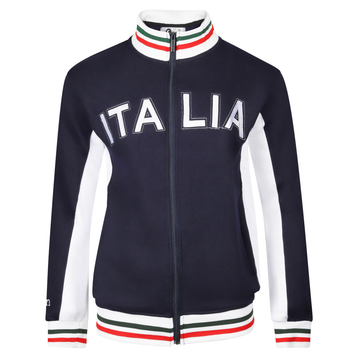 Sporty Italy retro track jacket from Pouchain for adults. The warm track jacket is based on the Italien football jackets from the 1970s. The Pouchain Italia training jacket is predominantly dark blue and contains white, red and green details. The sleeves are half white and the piping and collar are also white. The piping and collar are in the colors of the Italian flag and are striped in red, white and green. The Pouchain retro training jacket is characterized by the name of the country ITALIA in the middle of the chest. The name of the Italian sports brand, Pouchain, is printed on the right sleeve. In addition, the training jacket has two zippered pockets. The full-length zipper of the football jacket is dark blue. The Pouchain training jacket from Italy has a regular fit. Material: 60% cotton - 40% polyester.