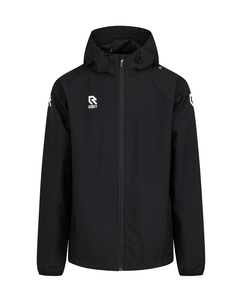 Robey Crossbar All Weather jacket with hood by Robey. This rain jacket is the perfect choice for wet or windy days. The All Weather jacket is lined with mesh for breathable and lightweight comfort. In addition, the Robey jacket features two side pockets. The hood comes with an adjustable drawstring. On the right chest you’ll find the Robey logo, and on the left shoulder a four-leaf clover. The Robey logo is also displayed on both sleeves. A must-have jacket for every athlete! This lightweight, water-repellent jacket with mesh lining is designed for maximum freedom of movement and comfort — both during training and on your way to the club. Thanks to the hood and two practical side pockets, you’ll stay dry and ready.