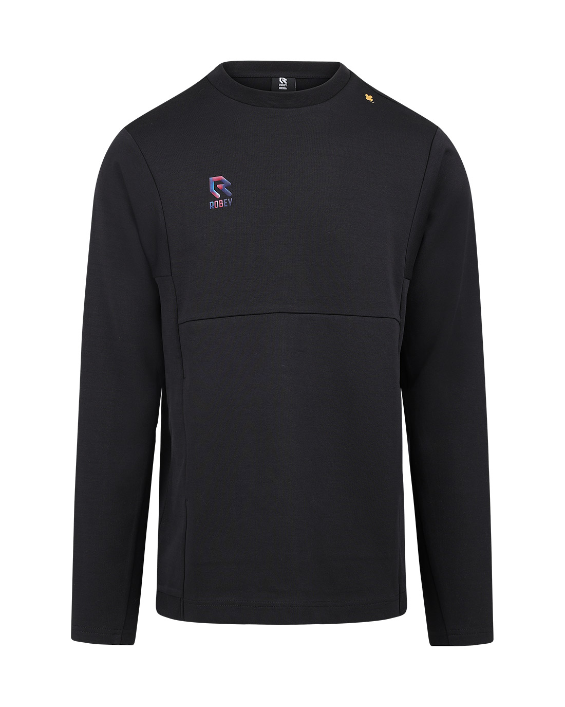 Sporty Off Pitch sweater in black from the brand Robey for men. The Off Pitch jersey is perfect to wear after training or after a game. The Off Pitch sweater has a stylish fit and is made of soft and high-quality cotton, which ensures optimal wearing comfort. The sweater has a round neckline and the letter R of Robey is applied to the right chest. On the left shoulder a four-leaf clover in gold. Material: 100% cotton.