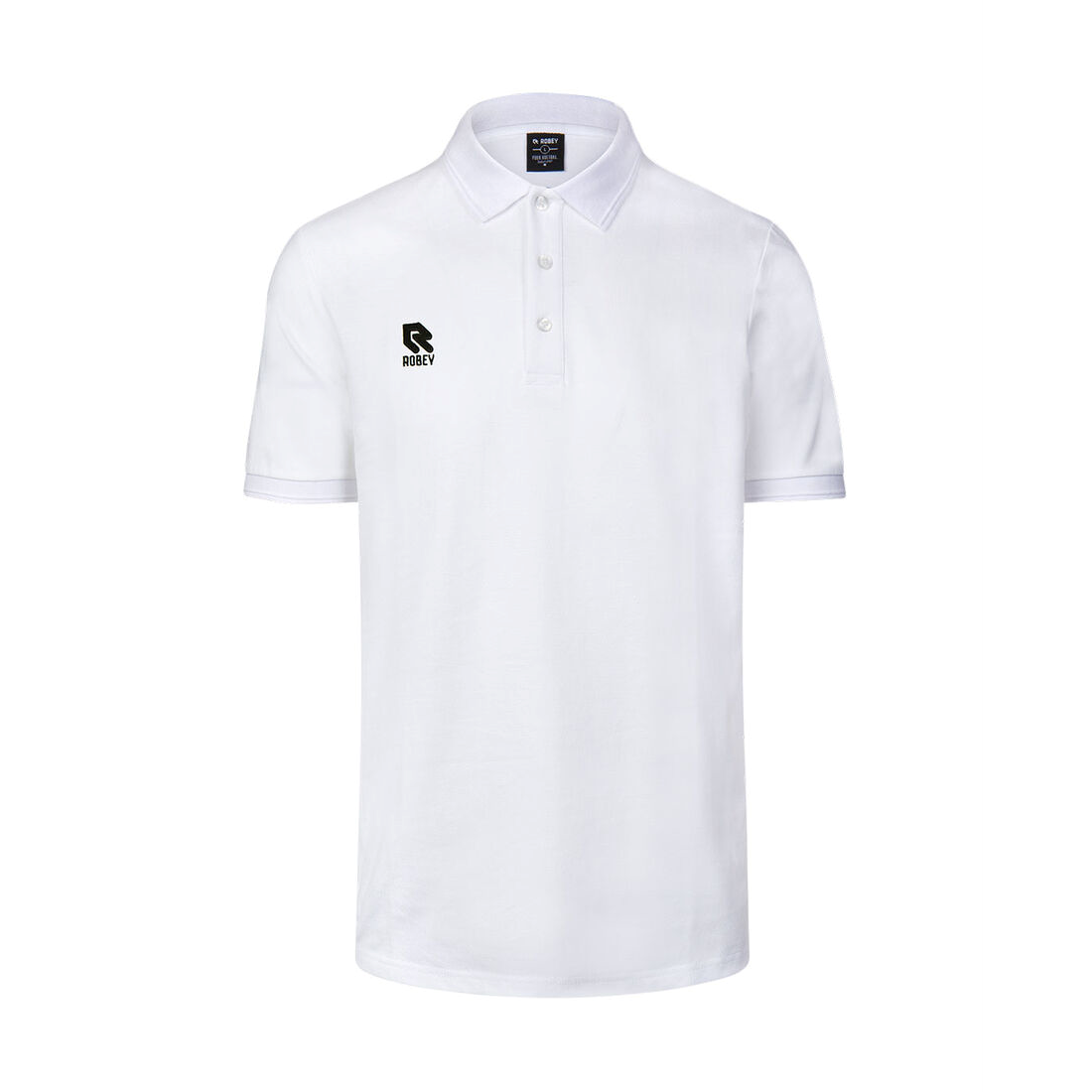 Sporty Off Pitch polo shirt from Robey in white. The polo is a classic polo shirt with a three button placket and made from high quality technical pique cotton. Ideal to wear before and after exercise. On the right chest the Robey logo and the left sleeve contains the name Robey. 100% cotton.