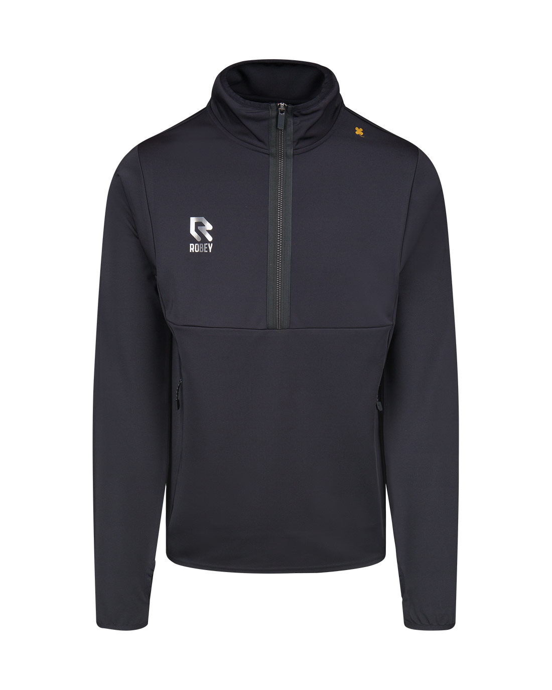 Sporty black Off Pitch Scuba Half-Zip top from the brand Robey. The Off Pitch jersey is perfect to wear after training or after a game. The Off Pitch top has a stylish fit and is made of soft and high-quality scuba material. The sweater has a half zipper and the letter R of Robey is applied in silver on the right chest. On the left shoulder a four-leaf clover in gold. Includes zip pockets. Material: polyester/elastane.