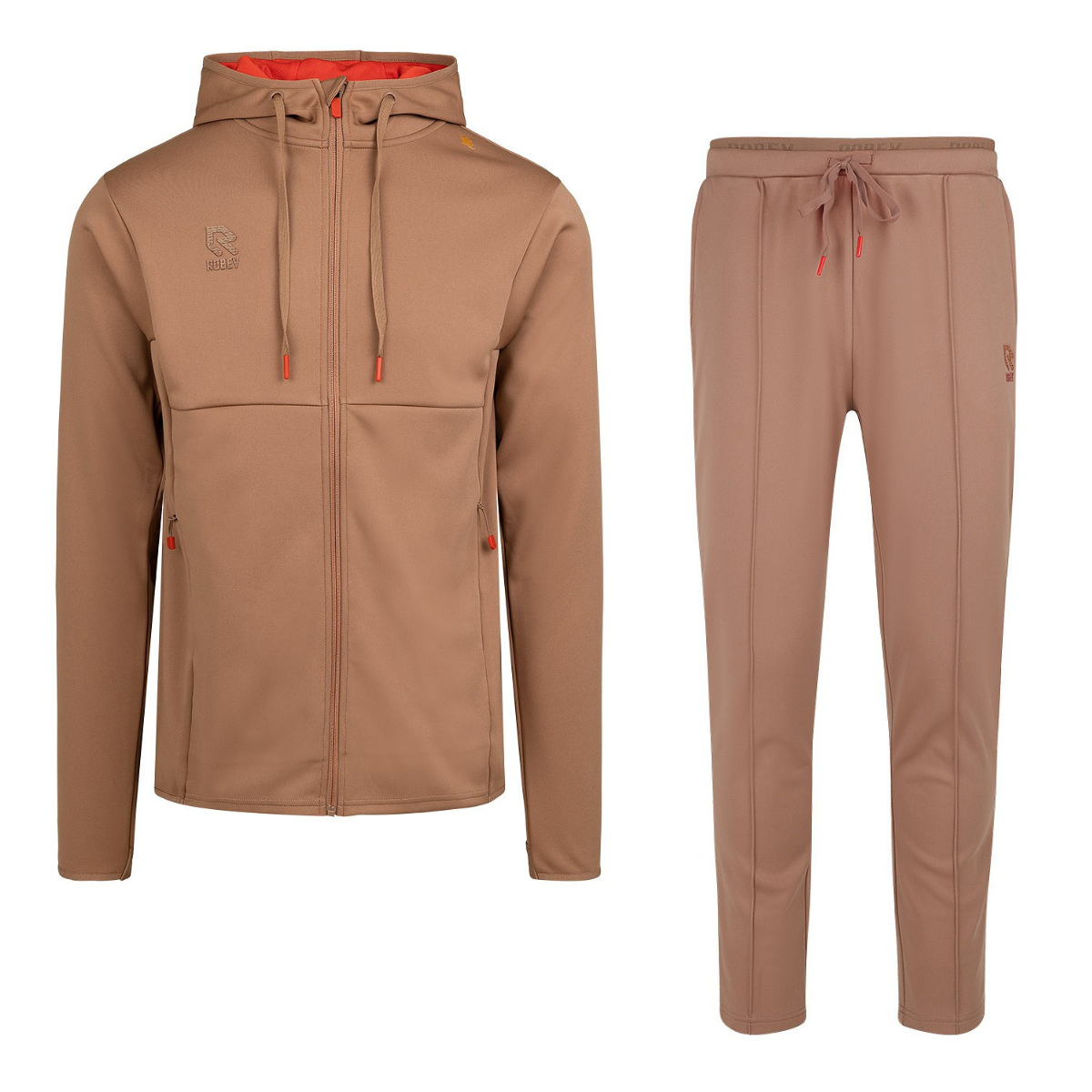 Sporty Off Pitch Scuba tracksuit from the brand Robey. The suit consists of a brown Off Pitch Full-Zip Hoodie and a brown Off Pitch Scuba training pants. The Off Pitch track jacket and pants are perfect to wear after and before training or competition. Travel in style with the Robey Off Pitch Scuba tracksuit in brown.
