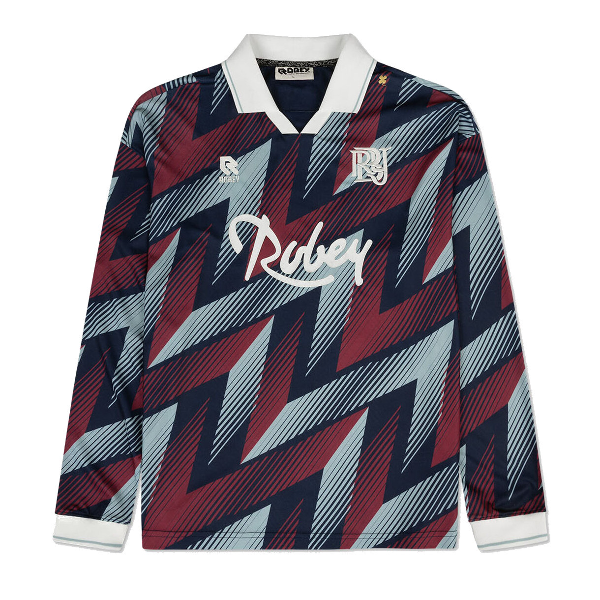 Robey Sportswear takes you back to the 90s with this retro football shirt for adults. The retro football shirt is an ode to football and shirts from the 90s. The Robey retro shirt has long sleeves and is characterized by an all-over zigzag pattern. The name of the Robey brand is in the middle of the chest and the Robey logo is on the right chest. The left chest has a special Robey Sportswear emblem. The polo collar and piping are white with a light blue stripe on it. The Robey retro football shirt is made in a limited edition - for the lover of football with character.