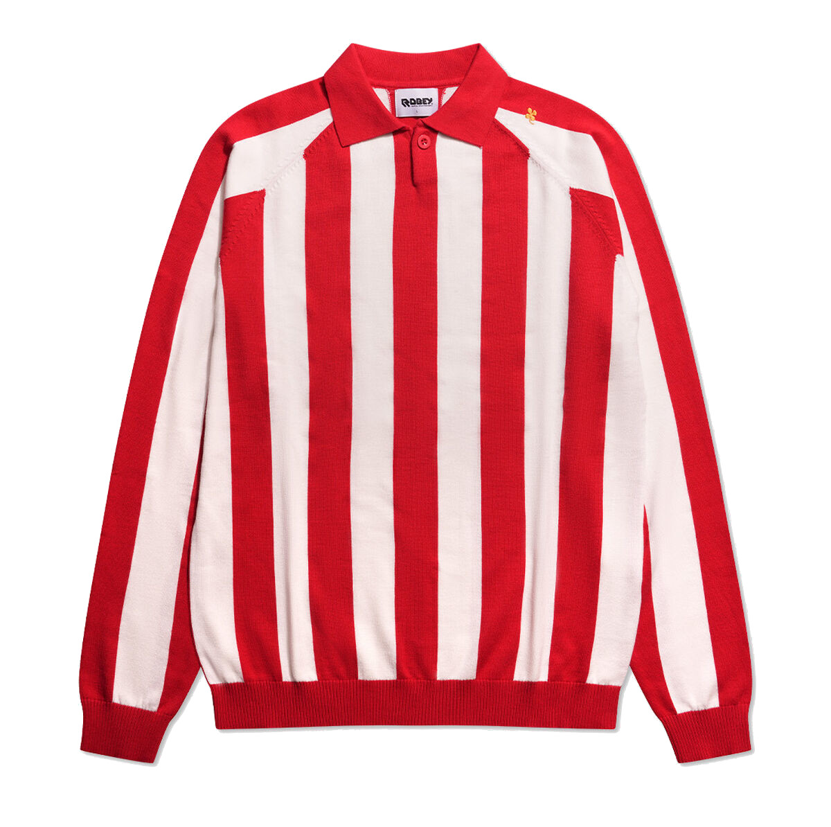 Knitted retro football shirt by Robey Sportswear for adults. The knitted football shirt features red and white stripes and is inspired by the football shirts of Sparta Rotterdam. The Robey Knit shirt is characterized by its red and white bands. In addition, the shirt has a red polo collar and a buttoned neckline. On the left shoulder there is a gold four-leaf clover. Fits true to size. We recommend ordering your usual size. This retro shirt is made from 100% soft cotton.