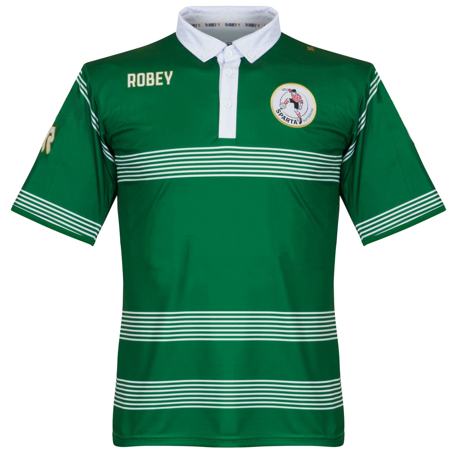 This is the official Sparta Rotterdam away shirt 2016-2017 from Robey Sportswear for children. In this football shirt, Sparta plays the Eredivisie and KNVB Cup away games during 2016-2017. The Sparta football shirt is mainly green and is characterized by different surfaces with horizontal white stripes. In addition, the football shirt of the team from Rotterdam is equipped with a classic polo collar in white. The right chest contains the Robey logo and the left chest is equipped with the club's logo. The trademark marks of the Dutch sports brand Robey can be found on the shoulders and sleeves. This football shirt was worn in the 2016/17 season by players such as Pogba, Brogno and Breuer. 100% polyester. The Sparta uniforms are equipped with BeyDry technology, which provides cooling, ventilation and moisture drainage, so that the players can perform optimally.