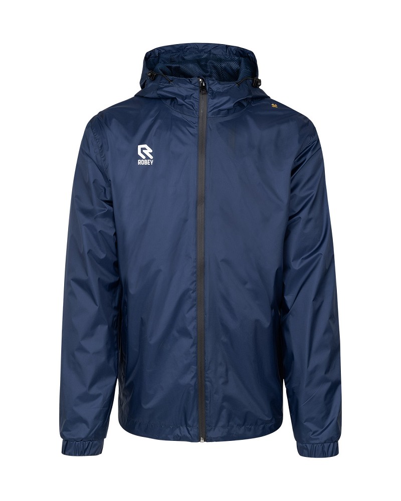 Sporty rain jacket with hood from the Robey brand. This raincoat is a perfect jacket for both during and after training. This rain jacket from Robey is lined in mesh for breathable and light wearing comfort. The Robey jacket also contains two side pockets with a zipper. The raincoat has a hood with an adjustable drawstring. The Robey logo on the right chest and a four-leaf clover on the left shoulder. The Robey logo on both shoulders. A reflective strip has been applied to the bottom of the back. A must have rain jacket for every athlete! Material: 100% polyester.