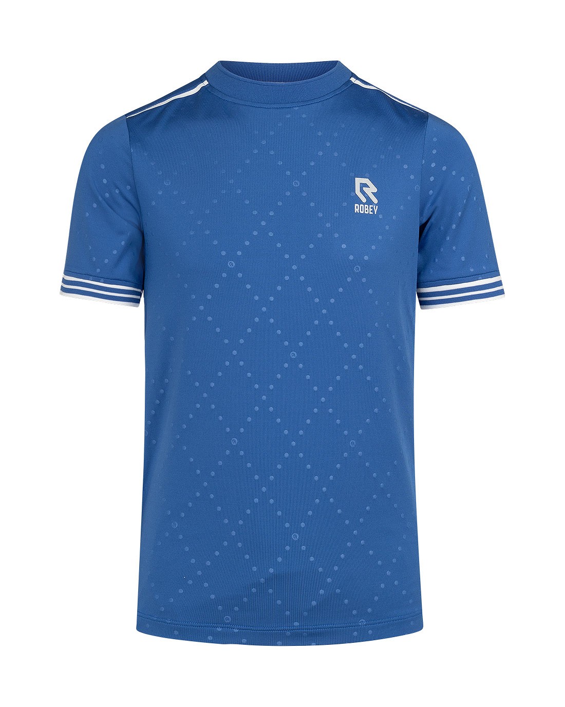 Sporty Robey tennis t-shirt in blue for men. The Tennis Cross t-shirt has an all-over print of a diamond pattern consisting of white dots. The piping is blue and white striped and the t-shirt also has a round neck. The material of the Robey tennis t-shirt is soft and quick-drying. In addition, the t-shirt offers enough stretch for sufficient freedom of movement. The ribbed neckline, sleeve finish and the subtle Robey monogram print give the t-shirt that little bit extra. The t-shirt has a regular fit.