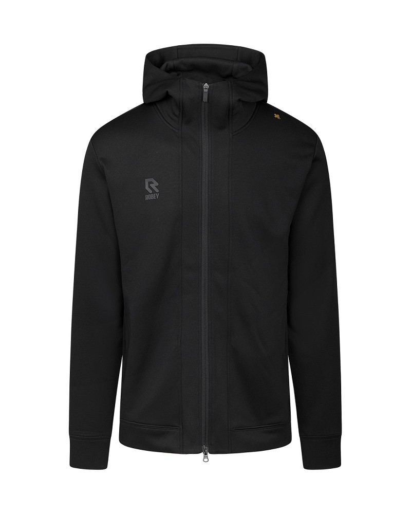Sporty Travel training jacket from the brand Robey for adults. The Travel jacket is perfect to wear while traveling to a match or before and after training. The Travel training jacket from Robey has a long stylish fit with a two-way zipper and is made of lightweight material. The Robey hooded training jacket has a hood and is equipped with two side pockets. On the right chest the letter R of Robey and on the left shoulder a four-leaf clover in gold. The Robey training jacket has a standard fit for maximum freedom of movement, both on the football field and while traveling. Lightweight and comfortable, it is designed to offer you comfort all day long. Whether it is a challenging training or a long journey, the Robey Travel jacket keeps you comfortable and in style. Material: 100% polyester.