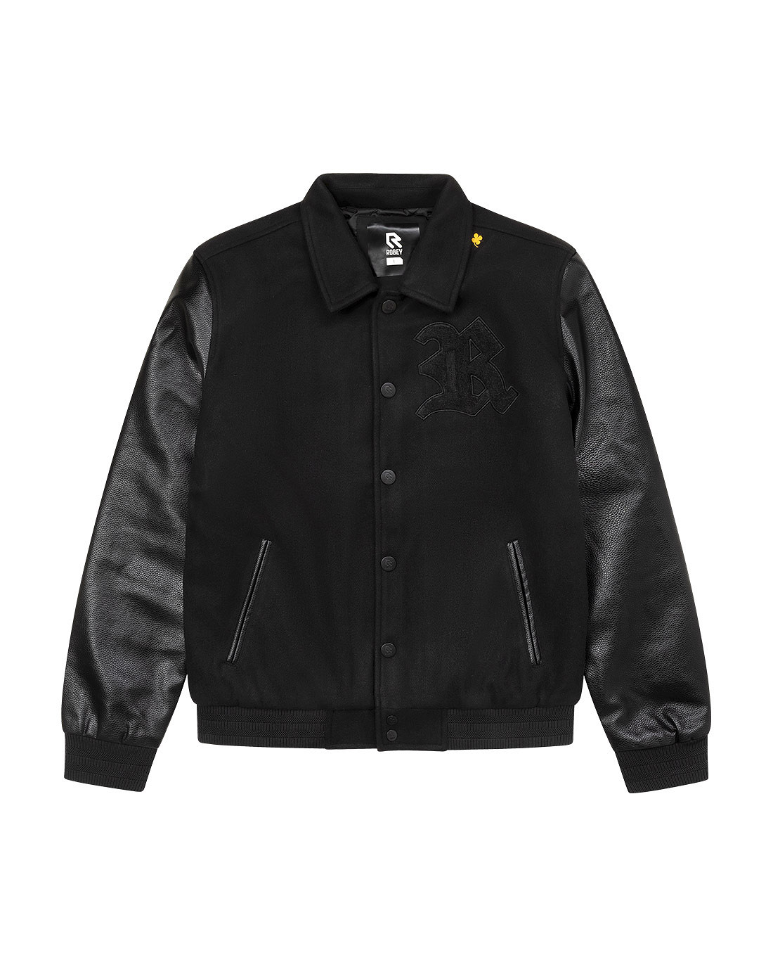Robey Varsity Jacket in black for adults. The Robey Varsity collection blends old-school sports culture with modern street attitude. The college jacket is designed for those moments between action and rest: after training, before a match, or on the go. The Robey college jacket offers uncompromising comfort. The '47 is a subtle yet powerful nod to Robey's roots. The number 47 is featured centered on the back of the jacket. A special Robey graphic appears on the left chest. The college jacket also features snap buttons and two slit pockets. The Varsity jacket has a regular fit. Made of 100% polyester.