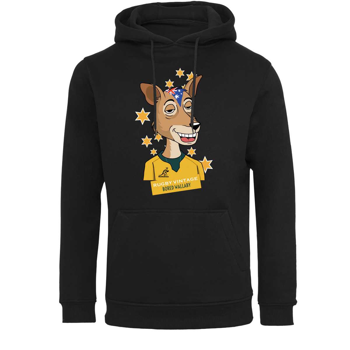 Sporty Australia hoodie from the brand Rugby Vintage in black. The hooded sweater is characterized on the front by a print of a Wallaby in the Australian rugby shirt. The Australian rugby union team's nickname is The Wallabies. In the background the stars which refer to the flag of Australia. The Rugby Vintage hoodie has a regular fit. The hoodie has a stylish design and is super comfortable. This hoodie is made of brushed sweat fabric and has a slightly longer fit. Of course, the hood with strings should not be missing and this also applies to the deep kangaroo pockets on the sides of this sweater. The further details such as set-in sleeves, ribbed hem and neckline, a half-moon neckline and neckband emphasize the quality of this hoodie. This hoodie consists of 70% cotton and 30% polyester.
