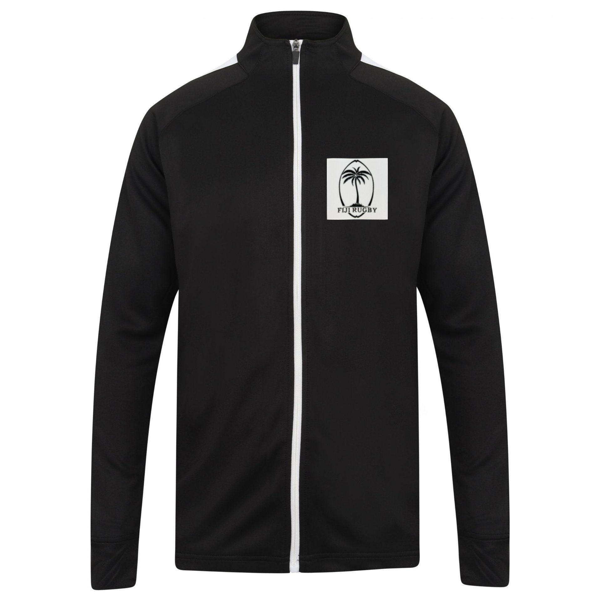Sporty Fiji Rugby track jacket from Rugby Vintage in black and white for men. The track jacket contains a vintage Fiji badge on the left hand side. The badge features a palm tree in black and the text FIJI RUGBY. The sleeves of the training jacket are characterized by white taping down to the forearms. The training jacket also has a zipper and a small stand-up collar. The side pockets also have a zipper. Ideal for safely storing your belongings. The Fiji Rugby training jacket from Rugby Vintage has a normal fit. Ideal for the true Fiji and rugby fan. Material: 100% polyester.