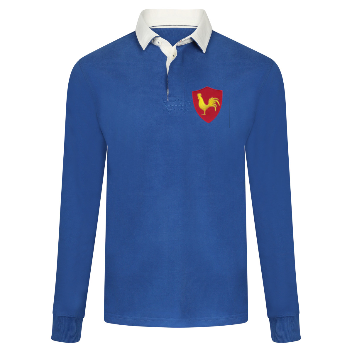 Blue France retro rugby shirt 1980s from the Rugby Vintage brand. This retro rugby shirt is based on the rugby shirts of the French rugby team from the 1980s. The France retro rugby shirt features a white polo collar and a white neck. The left chest features a red vintage badge with the famous French rooster. The Rugby Vintage products have a normal and comfortable fit. Material: 100% cotton.