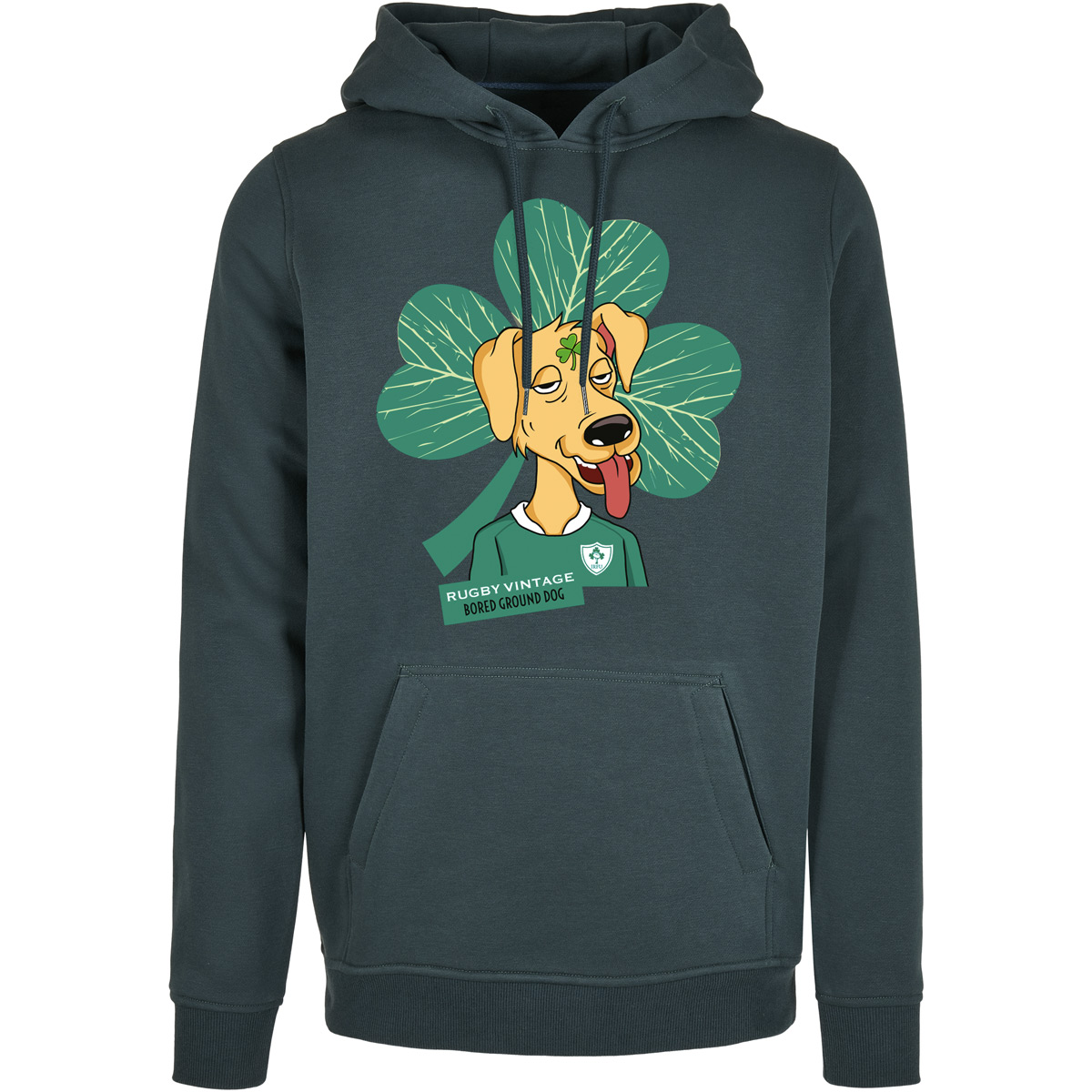 Sporty Ireland hoodie from Rugby Vintage in dark green. The hooded sweater features a print of a dog in an Ireland rugby shirt on the front. The mascot of Ireland's rugby team is a dog. The Rugby Vintage hoodie has a regular fit. The hoodie has a stylish design and is super comfortable. This hoodie is made of brushed sweat fabric and has a slightly longer fit. Of course, the hood with strings should not be missing and this also applies to the deep kangaroo pockets on the sides of this sweater. The further details such as set-in sleeves, ribbed hem and neckline, a half-moon neckline and neckband emphasize the quality of this hoodie. This hoodie consists of 70% cotton and 30% polyester.