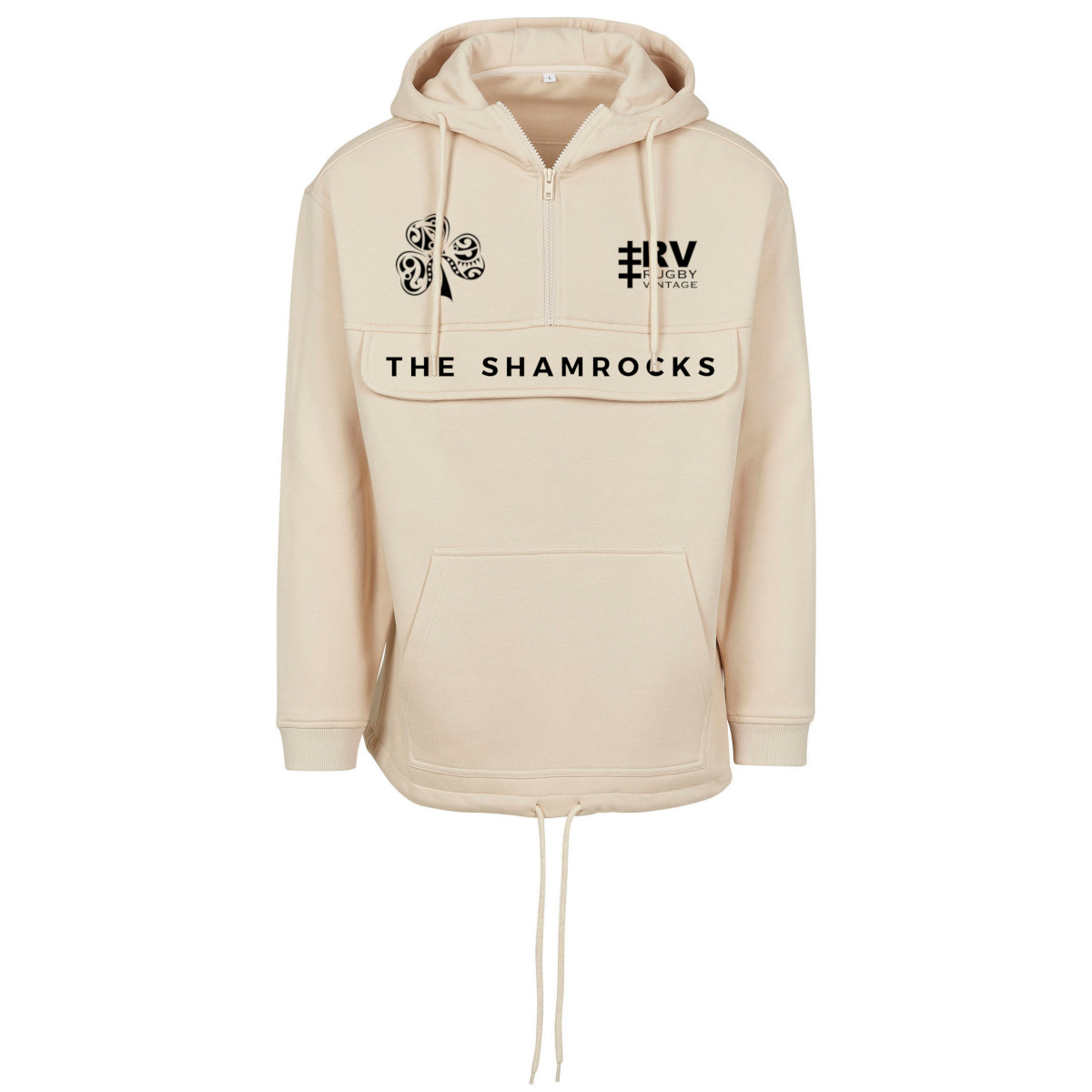 Cool and sporty Ireland anorak hoodie from Rugby Vintage in beige. The anorak hooded sweater features the nickname of the Irish rugby team: THE SHAMROCKS on the flap to the chest pocket. The left chest features the Rugby Vintage logo and the other a graphic image of a clover (symbol of Ireland). In addition to the flap to the chest pocket, this chest pocket also has a zipper. Ideal for storing your belongings. The anorak also has a hood and a 1/4 zipper to the chest. There is a string at the bottom to adjust the anorak hoodie. The anorak hoodie from Rugby Vintage has a normal fit. Material: 65% cotton - 35% polyester.