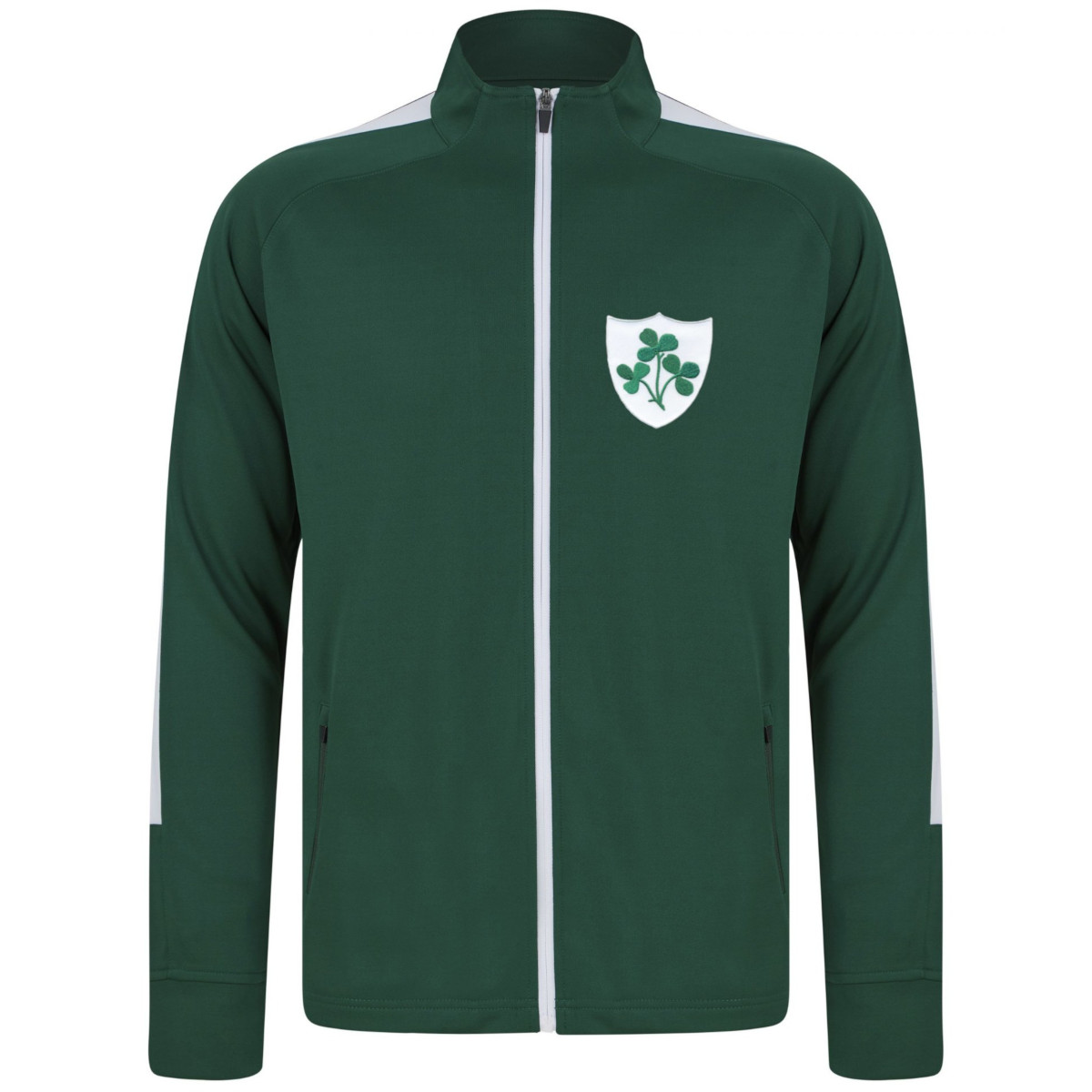 Sporty Ireland track jacket from Rugby Vintage in green and white. The track jacket contains a vintage Ireland badge on the left chest. This badge contains a clover in green. The sleeves of the training jacket are characterized by white taping down to the forearms. The training jacket also has a zipper and a small stand-up collar. The side pockets also have a zipper. Ideal for safely storing your belongings. The Ireland The Shamrocks training jacket from Rugby Vintage has a normal fit. Material: 100% polyester.