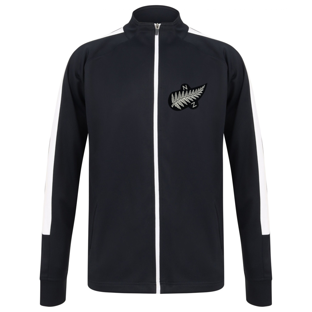 Sporty New Zealand training jacket from Rugby Vintage in black and white. The track jacket features a vintage New Zealand badge on the left chest. This badge features the famous New Zealand silver fern and the initials NZ. The sleeves of the training jacket are characterized by white taping down to the forearms. The training jacket also has a zipper and a small stand-up collar. The side pockets also have a zipper. Ideal for safely storing your belongings. The New Zealand training jacket from Rugby Vintage has a normal fit. Ideal for the true New Zealand rugby fan. Material: 100% polyester.
