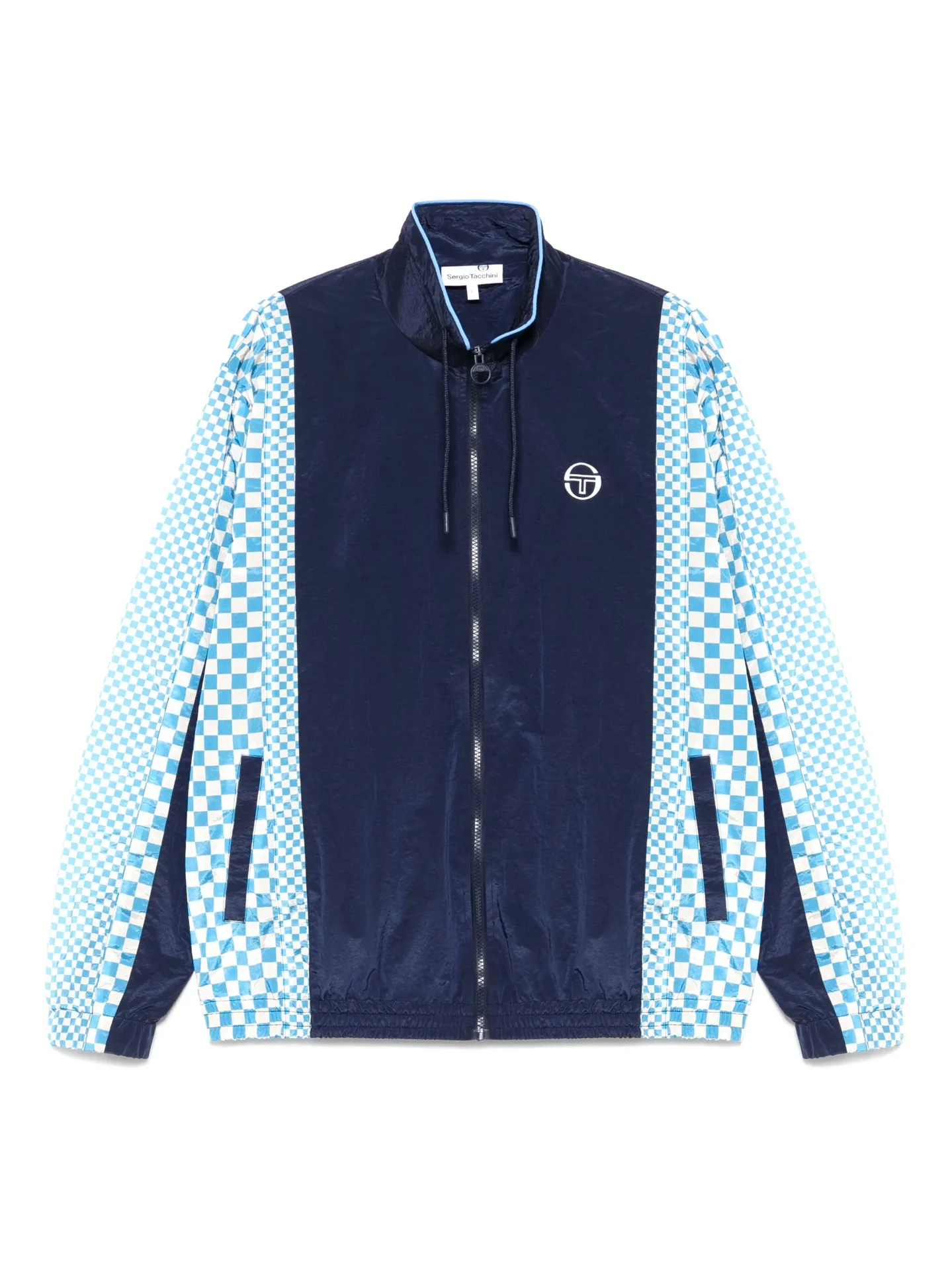 Sporty Sergio Tacchini training jacket for men. The Sergio Tacchini training jacket is of the Alfredo model and is inspired by the retro training jackets of Sergio Tacchini. The training jacket is in the color off-white with blue. The middle part of the jacket is dark blue. The sides and sleeves are characterized by a checkerboard pattern in white with light blue. The Sergio Tacchini logo is applied to the left chest. In addition, the training jacket has two slit pockets. The Sergio Tacchini training jackets are ideal for casual wear. Material: 100% polyamide.