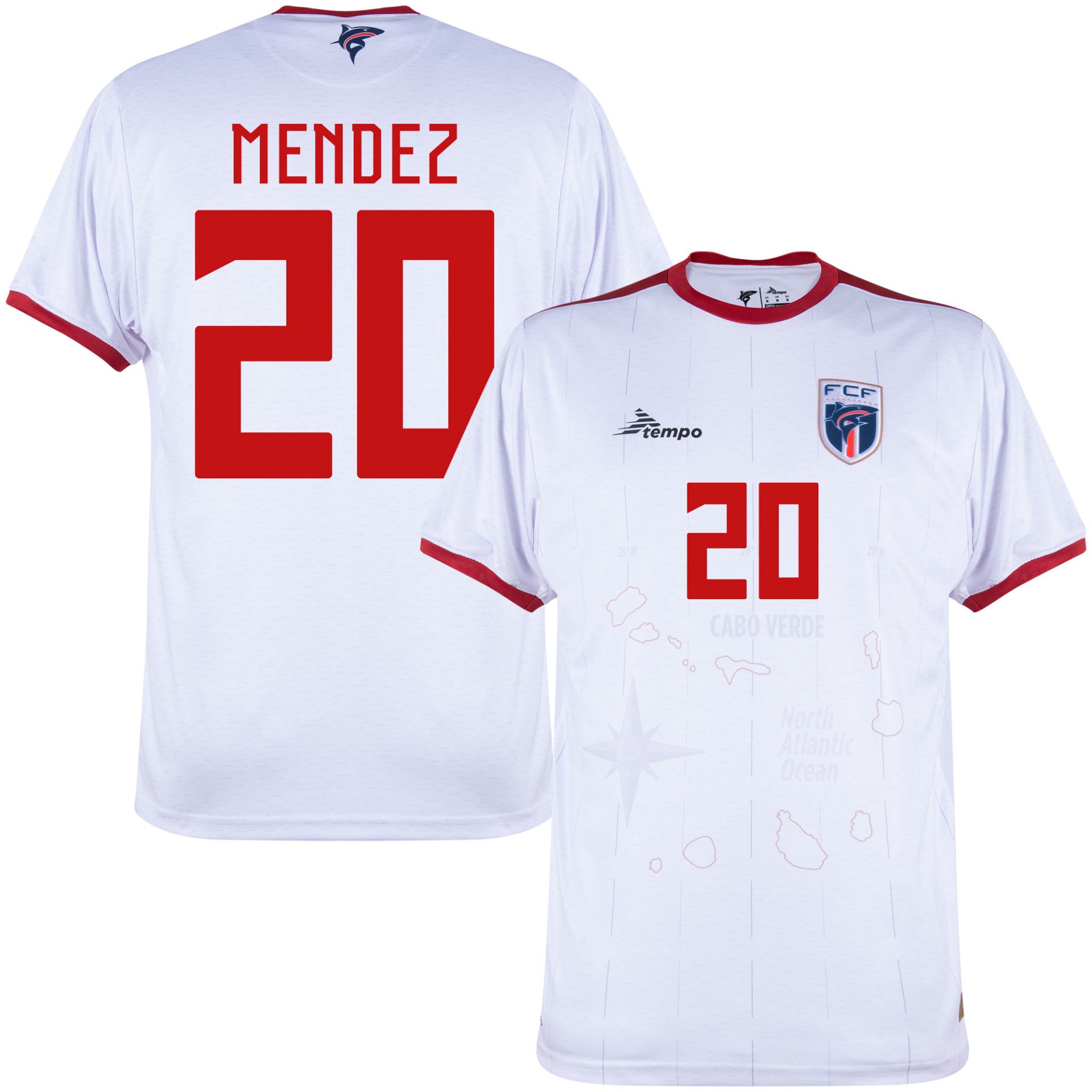This is the official Cape Verde 2024/25 away jersey for adults by Tempo Sport. This Cape Verde away jersey features the official printing of Mendez (20). The Cape Verde national football team will wear this jersey during away matches in the 2024–2025 period. The jersey is predominantly white and features an all-over print of islands and the country’s location in the North Atlantic Ocean. The coordinates of the country are also integrated into the design. The round neck is red, as is the trim at the bottom of the sleeves. The right chest shows the logo of kit supplier Tempo, while the left chest features the badge of the Cape Verde Football Federation. On the back of the neck is a graphic of a shark, referring to the nickname of the national team: Tubarões Azuis (Blue Sharks). The Cape Verde football shirt has a regular fit.