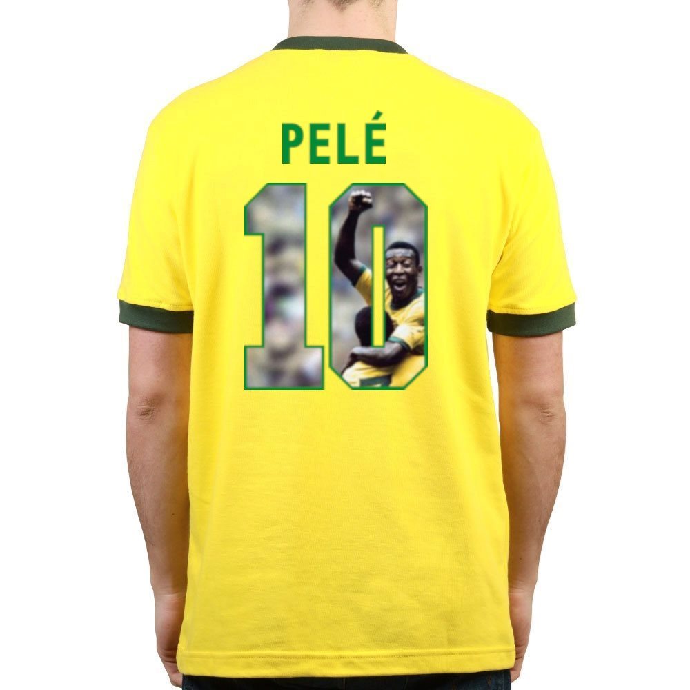 This is the Brazil retro football shirt from TOFFS Retro. This retro shirt is based on the Brazil football shirt that was worn during the 1970 World Cup. The back of the shirt has a special photo style print, the number 10 shows an image of the Brazilian legend Pelé.