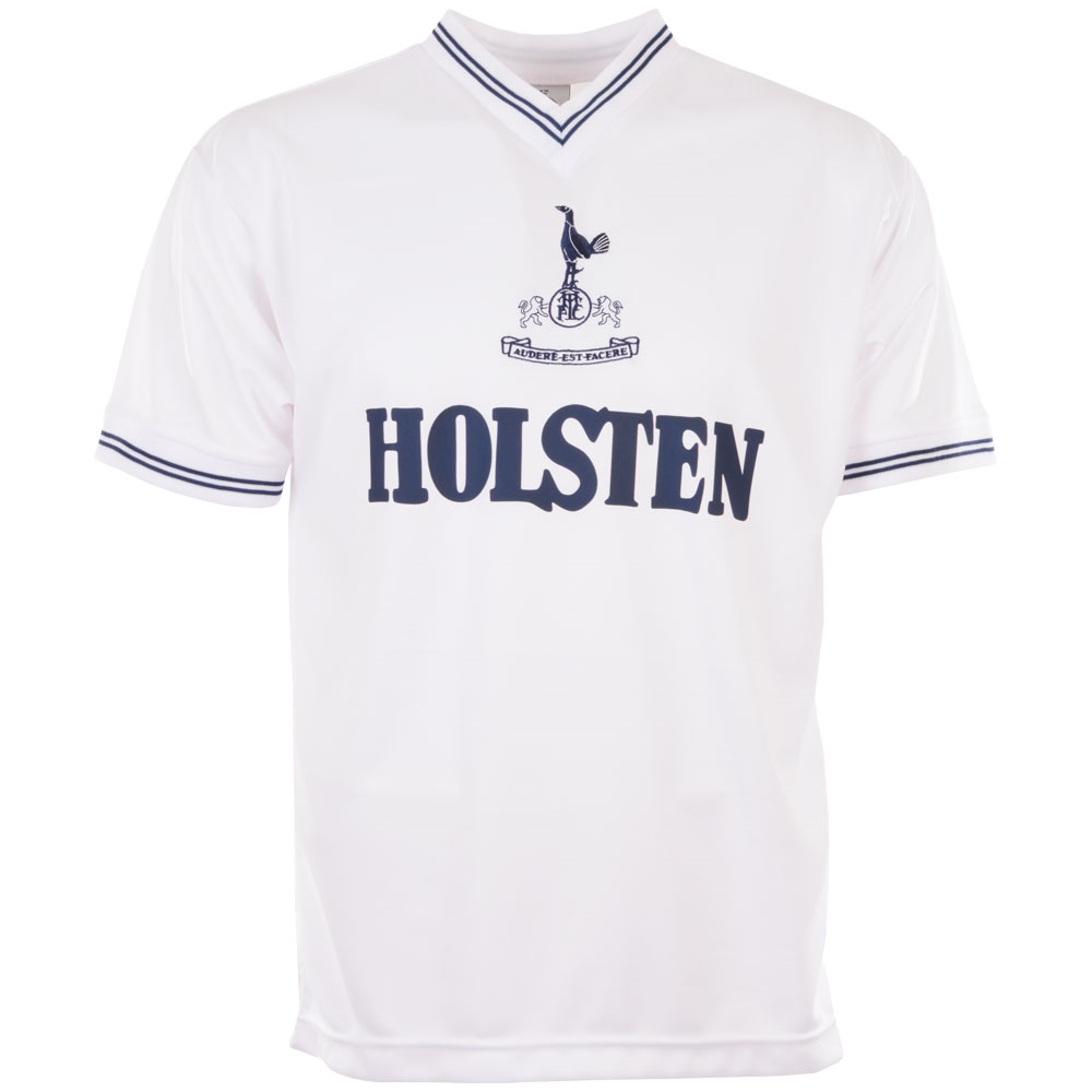 Retro football shirt from Tottenham Hotspur based on shirt from the period 1983-1985. The Tottenham Hotspur retro shirt looks classic and stylish. The Spurs roster at the time was also very classy. The white Tottenham shirt has short sleeves and a v-neck. The trims and v-neck are white with a thin blue stripe. On the chest the main sponsor at that time is Holsten. Holsten is a beer brewer and was, among other things, the main sponsor of Tottenham Hotspur between 1983 and 1995. Above Holsten the Spurs logo with the text: audere est facere (dare to do). 100% polyester.